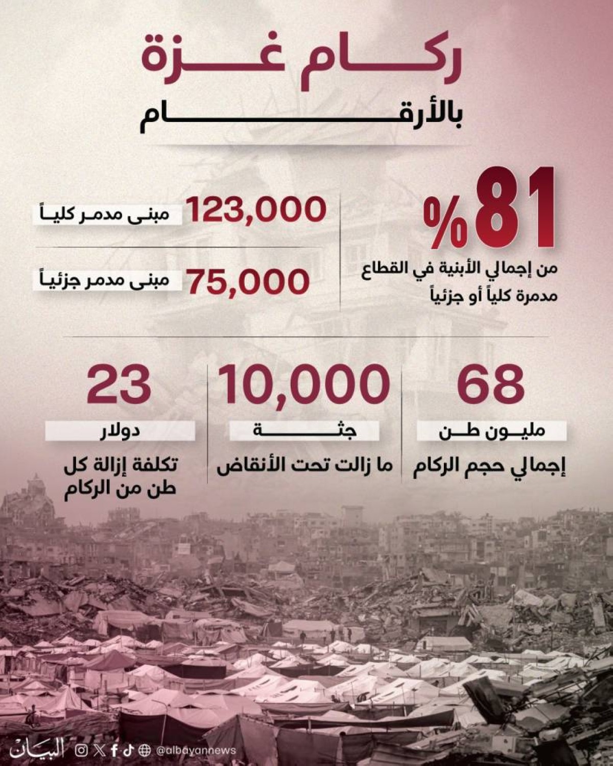 ونشرت صحيفة وول ستريت جورنال تقريراً رصدت فيه حجم الدمار والركام في قطاع غزة جراء الحرب الإسرائيلية على القطاع استناداً إلى أرقام الأمم المتحدة وفق إحصائية جديدة، حيث دمّرت آلاف الغارات الجوية، إلى جانب القتال البري وعمليات الهدم المُتحكَّم بها، أكثر من 123,000 مبنى في قطاع غزة، وألحقت أضراراً بدرجات متفاوتة بنحو 75,000 مبنى آخر، ما يعادل 81% من إجمالي الأبنية في القطاع، وذلك وفق أحدث مراجعة لصور الأقمار الصناعية أجرتها الأمم المتحدة.