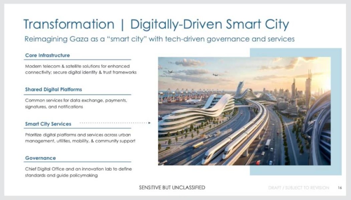 وتبدو الخطة الجديدة معدلة عن نسخة سابقة طرحها الرئيس الأمريكي دونالد ترامب وروج لها باسم ريفييرا الشرق الأوسط، حيث أن الخطة الجديدة تركز بشكل أقل على المنتجعات التي أظهرت الرفيرا وكأنها موقع لقضاء الأثرياء عطلاتهم. في النسخة الجديدة يبدو التركيز على الجانب التكنولوجي واضحاً.
