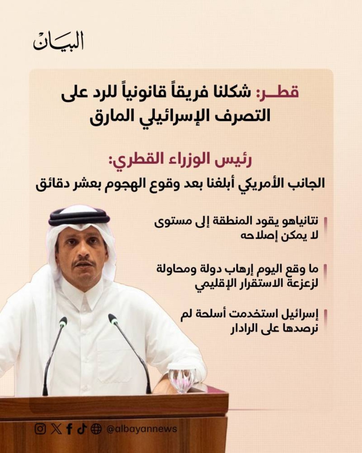 وأضاف آل ثاني أن مسؤولين أمريكيين حذروا قطر من الهجوم الإسرائيلي بعد عشر دقائق من بدء الهجوم، ووصف الهجوم بأنه "عملية غادرة".