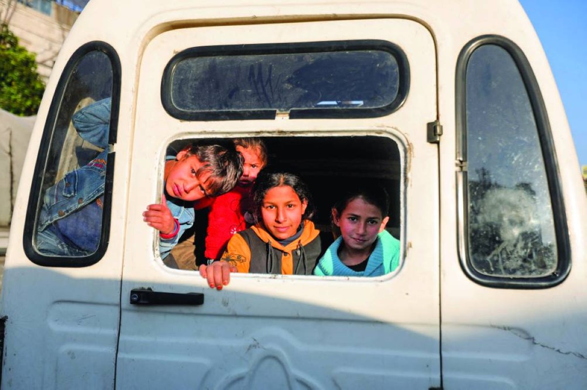 أطفال ينظرون من نافذة حافلة في بلدة جوبر السورية في الغوطة الشرقية على مشارف دمشق