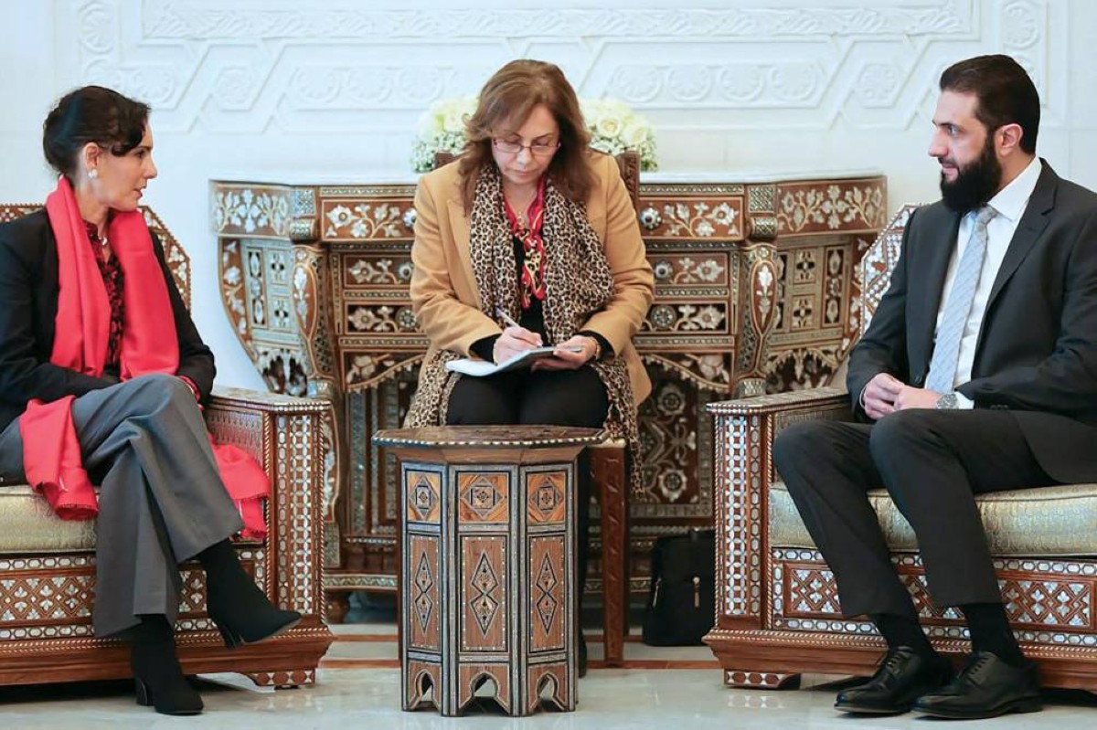 أحمد الشرع خلال اجتماعه مع رئيسة إدارة الأزمات بالاتحاد الأوروبي في دمشق