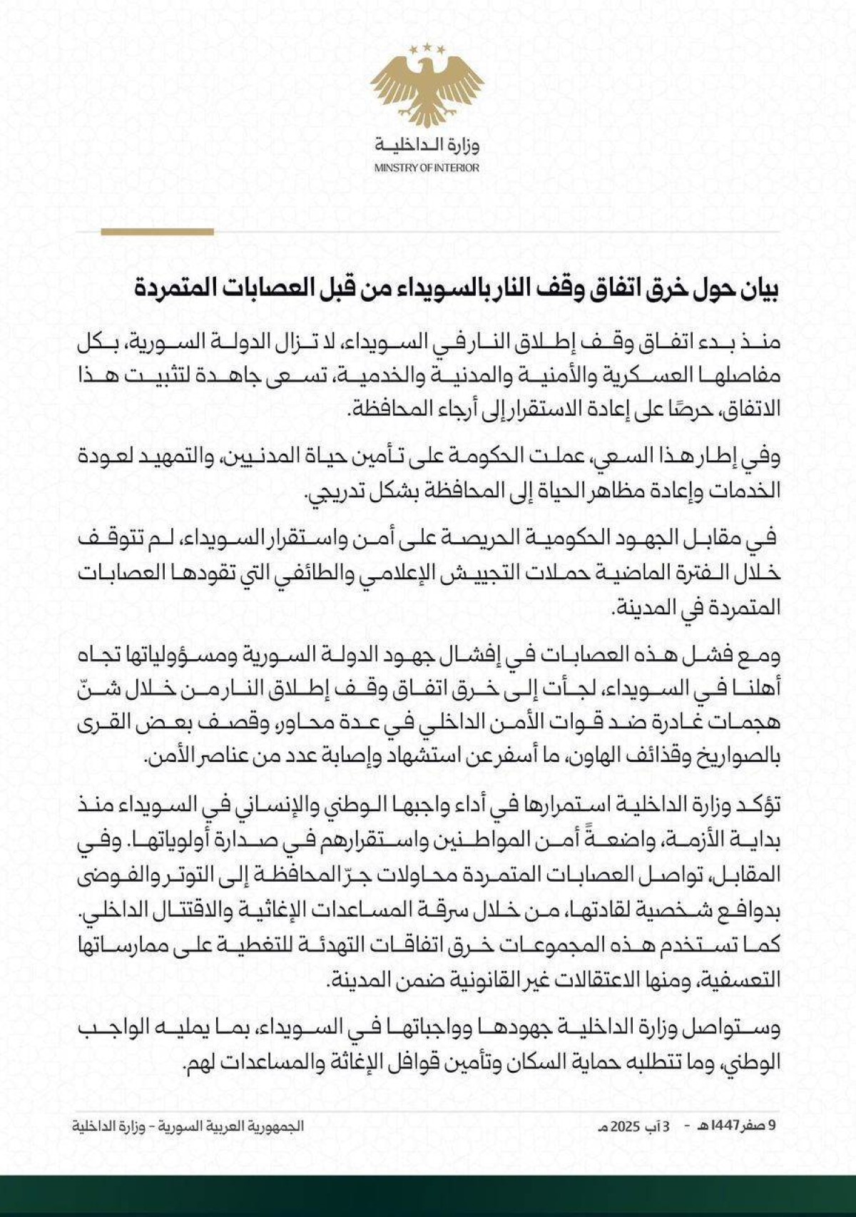 وقال مصدر أمني، في تصريحات نقلتها قناة «الإخبارية السورية» الرسمية، إن خروقات وقف إطلاق النار أدت إلى «استشهاد عنصر من الأمن الداخلي، وإصابة آخرين»، لافتاً إلى أن الهجمات تزامنت مع «السعي الحكومي لإعادة الاستقرار والهدوء لمحافظة السويداء تمهيداً لعودة الخدمات ومظاهر الحياة فيها»، كما أن الهجمات «تؤكد عزم المجموعات الخارجة عن القانون على إبقاء السويداء في دوامة التوتر والتصعيد والفوضى الأمنية، تؤثر على عمل قوافل الإغاثة التي تصل إلى أهلنا في المحافظة».