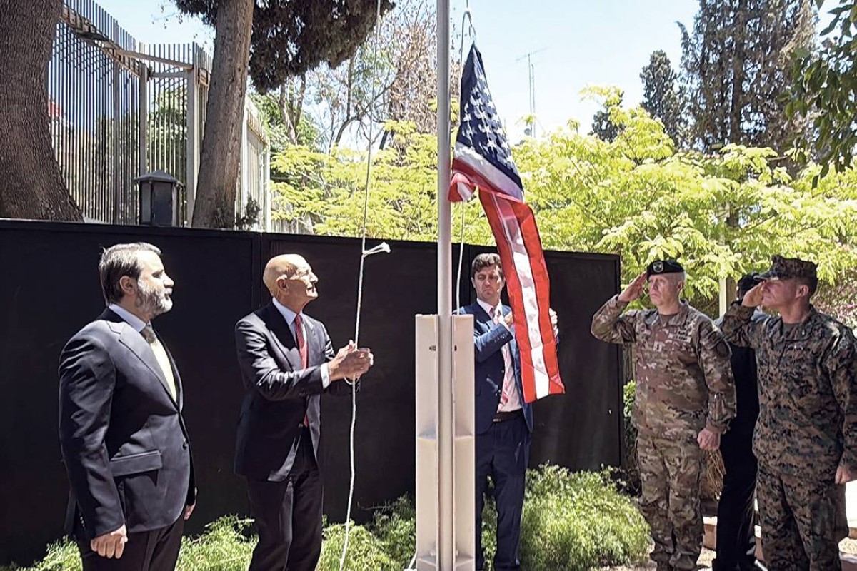 وكشف المبعوث الأمريكي عن أن إدارة الرئيس دونالد ترامب تعتزم رفع اسم سوريا من قائمة الدول الراعية للإرهاب، ورفع توماس باراك العلم الأمريكي فوق مقر إقامته بدمشق، أمس، لأول مرة منذ إغلاق السفارة قبل 13 عاماً.