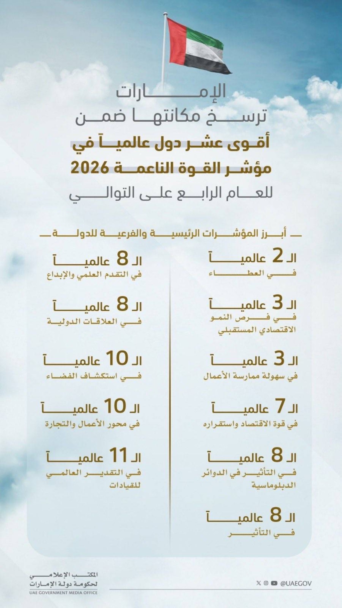 وقال سموه في تدوينة على حسابه في منصة إكس: "وفقاً لأهم تقرير عالمي للقوة الناعمة شمل 193 دولة .. تم الإعلان اليوم في المنتدى الاقتصادي العالمي دافوس عن نتائجه.. جاءت دولة الإمارات في المركز العاشر عالمياً في الترتيب العام .. وجاءت في المركز الثاني عالمياً في العطاء والثالث عالمياً في فرص النمو الاقتصادي .. والثامن عالمياً في التأثير في الدوائر الدبلوماسية العالمية".