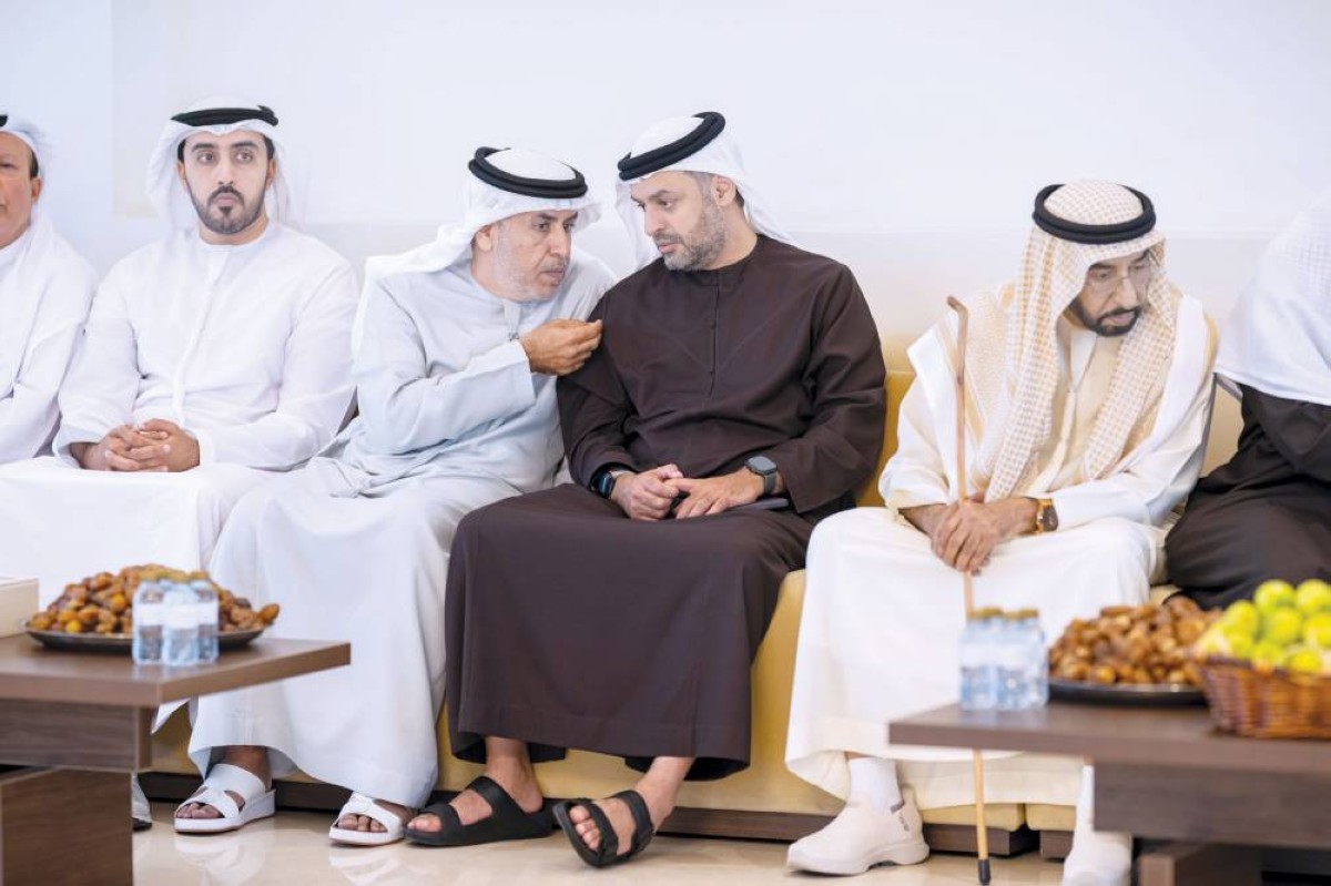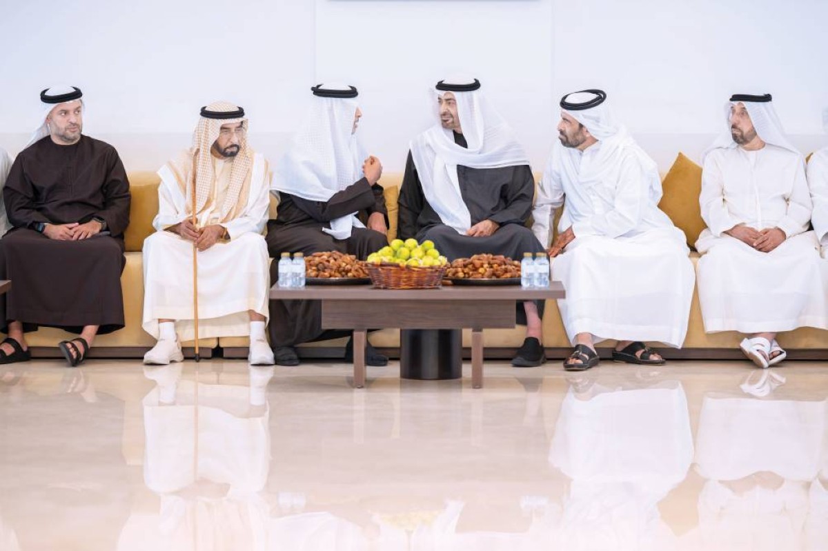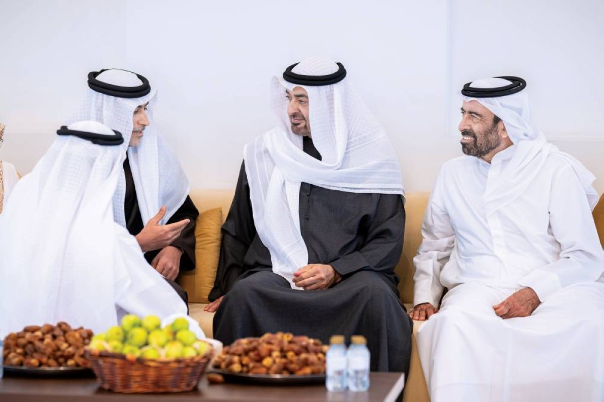 محمد بن زايد خلال العزاء بحضور محمد بن حمد بن طحنون
