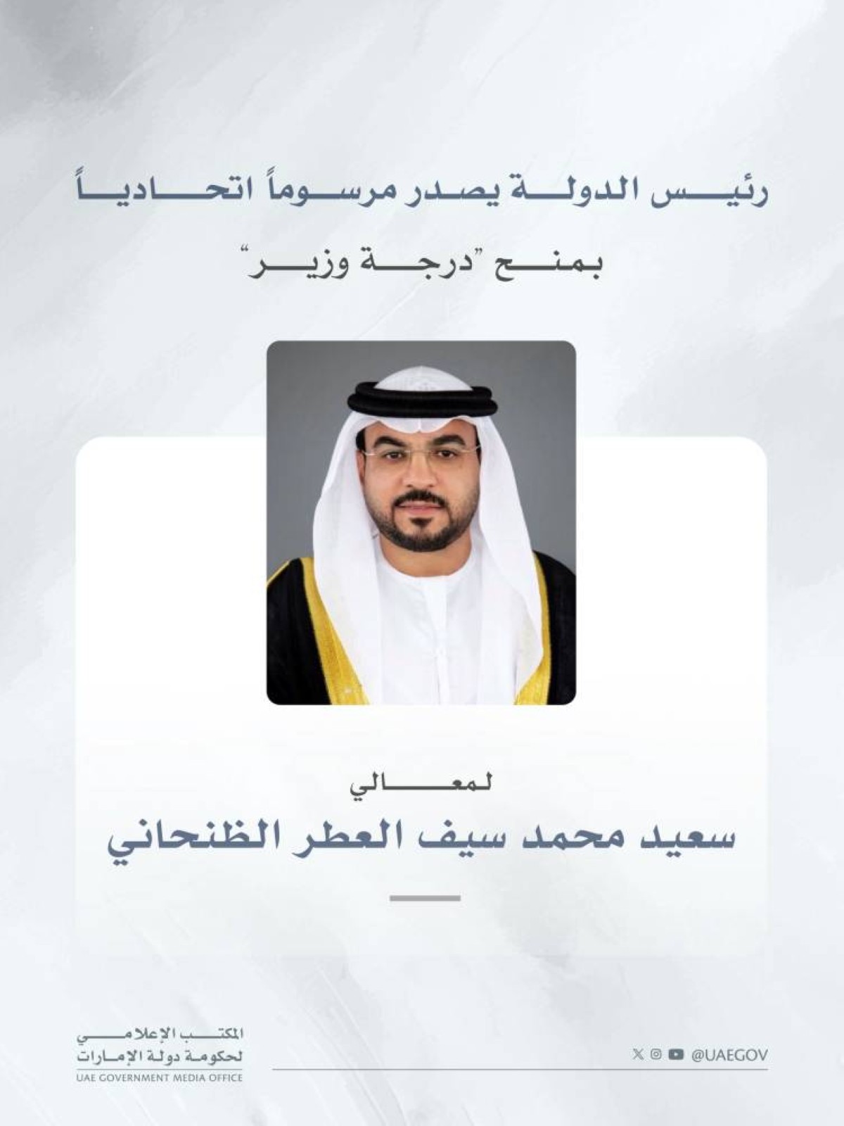 أصدر صاحب السمو الشيخ محمد بن زايد آل نهيان، رئيس الدولة، حفظه الله، مرسوماً اتحادياً بشأن منح معالي سعيد محمد سيف العطر الظنحاني، "درجة وزير"، على أن يعمل بهذا المرسوم من تاريخ صدوره وينشر في الجريدة الرسمية.