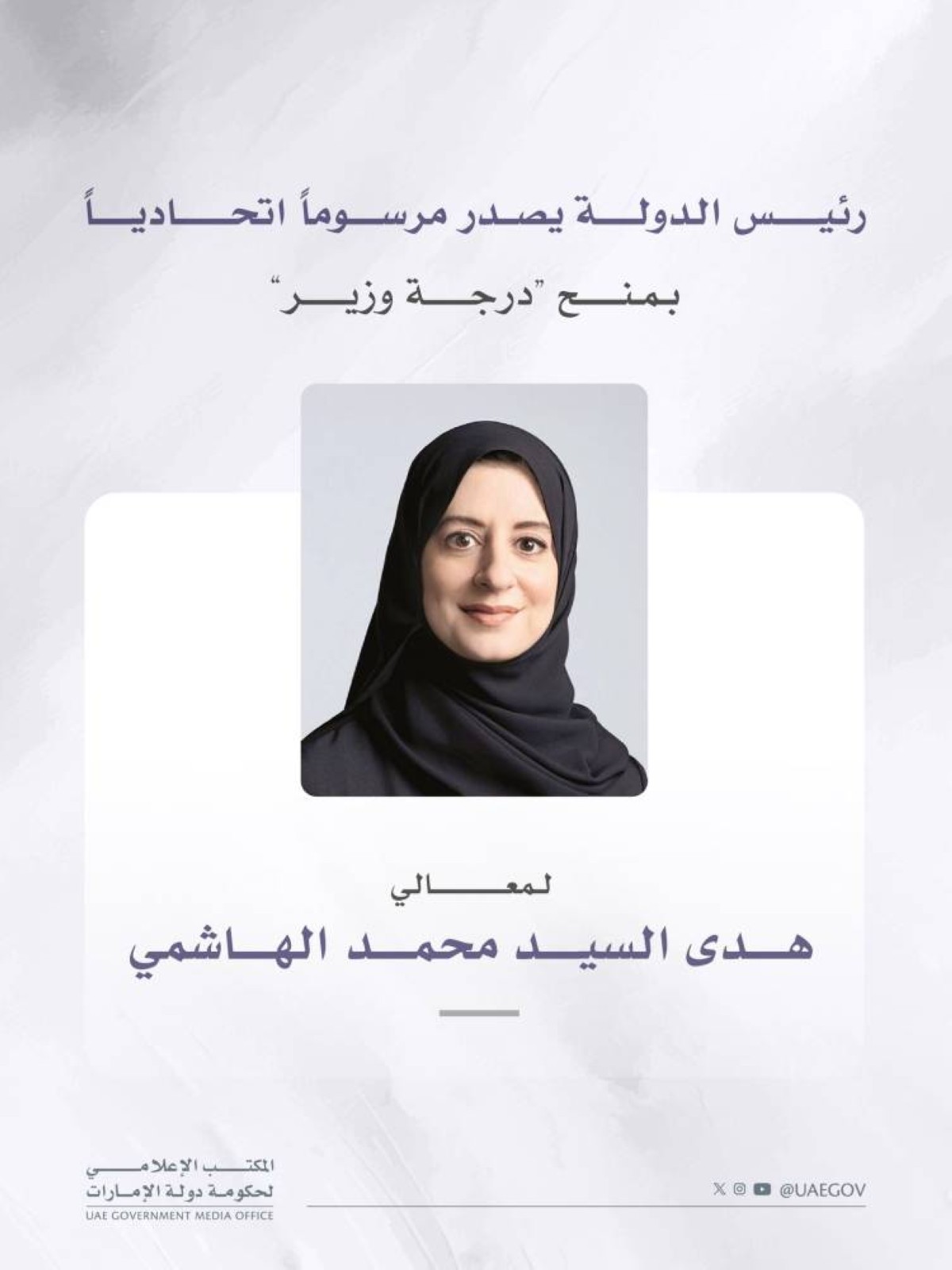 أصدر صاحب السمو الشيخ محمد بن زايد آل نهيان، رئيس الدولة، حفظه الله، مرسوماً اتحادياً بشأن منح معالي هدى السيد محمد الهاشمي، "درجة وزير"، على أن يعمل بهذا المرسوم من تاريخ صدوره وينشر في الجريدة الرسمية.