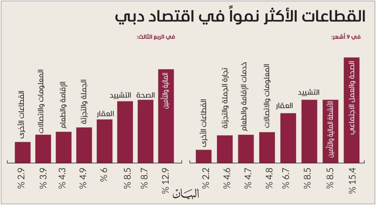 كما سجل قطاع الأنشطة المالية وأنشطة التأمين نمواً قوياً بلغ 8.5% مساهماً بنسبة 12% في الناتج المحلي الإجمالي في الإمارة خلال الشهور التسعة الأولى، بالتوازي مع قطاع التشييد الذي بلغ نموه أيضاً 8.5 % مساهماً بنسبة 6.7 % في الناتج المحلي الإجمالي في الإمارة.