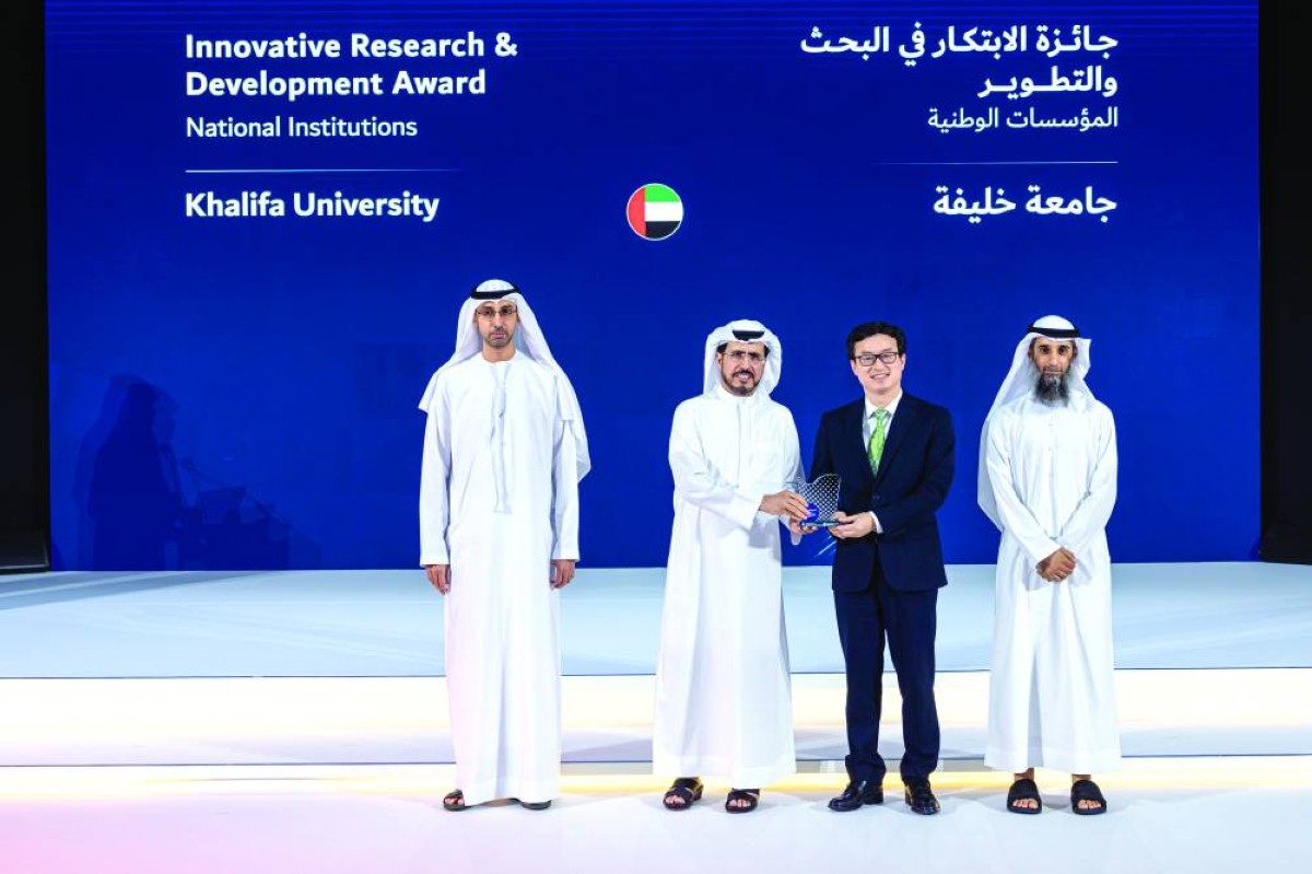 وفازت جامعة خليفة بالجائزة الأولى في فئة «الابتكار في البحث والتطوير - المؤسسات الوطنية»، وذلك عن مشروع لإنتاج المياه العذبة من مياه البحر، ويجمع الملح من دون إفراز محاليل ملحية، باستخدام تقنية التقطير الحراري، المعتمد كلياً على الطاقة الشمسية.