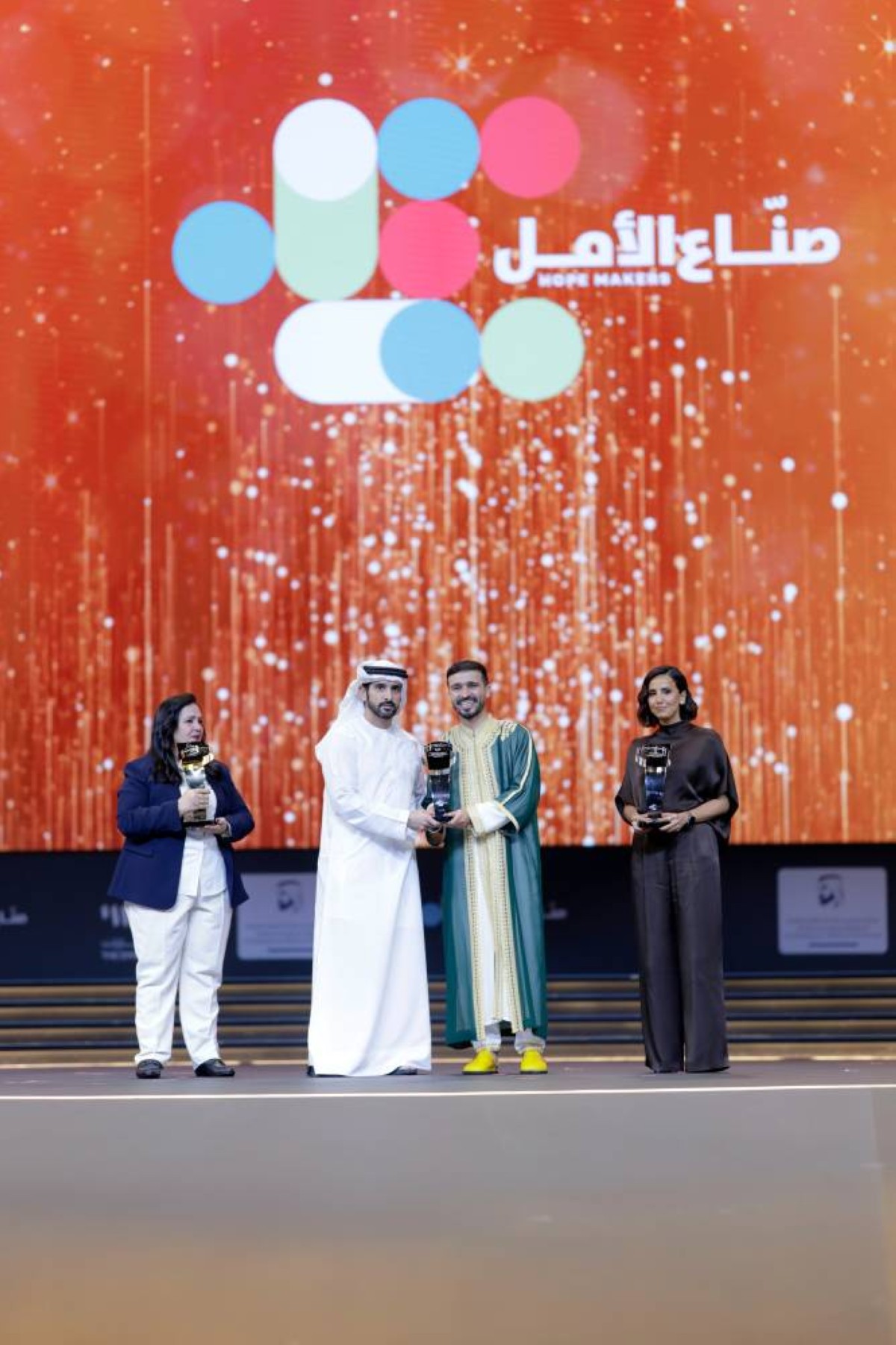 وأضاف سموه " نبارك للفائزة فوزية محمودي .. وهند الهاجري من الكويت .. وعبدالرحمن الرائس من المغرب .. فوزهم بدورة صناع الأمل …. في دبي الكل فائز اليوم .. والجميع صانع خير نفخر به وبأعماله".