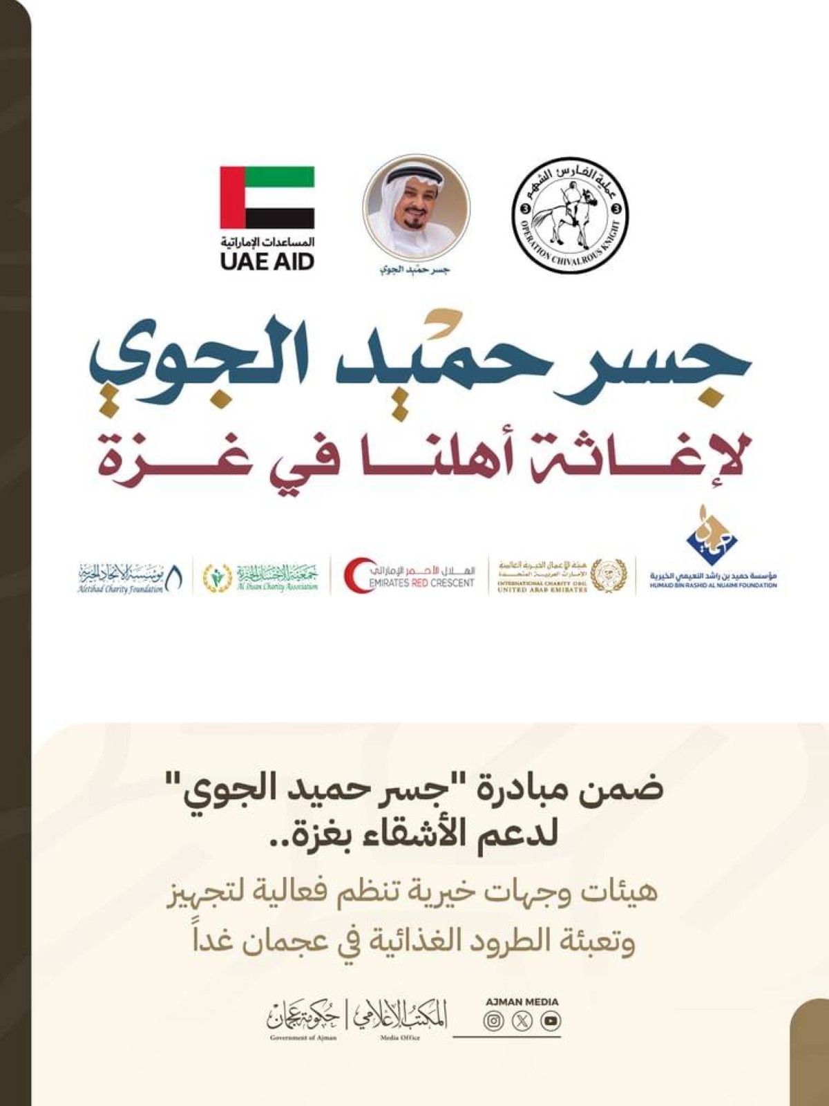 وكان صاحب السمو الشيخ حميد بن راشد النعيمي عضو المجلس الأعلى حاكم عجمان، قد وجّه بإطلاق جسر جوي إنساني لإغاثة قطاع غزة، تزامناً مع شهر رمضان المبارك، ضمن عملية "الفارس الشهم 3" لدعم الشعب الفلسطيني وتخفيف معاناته في ظل الظروف الراهنة.