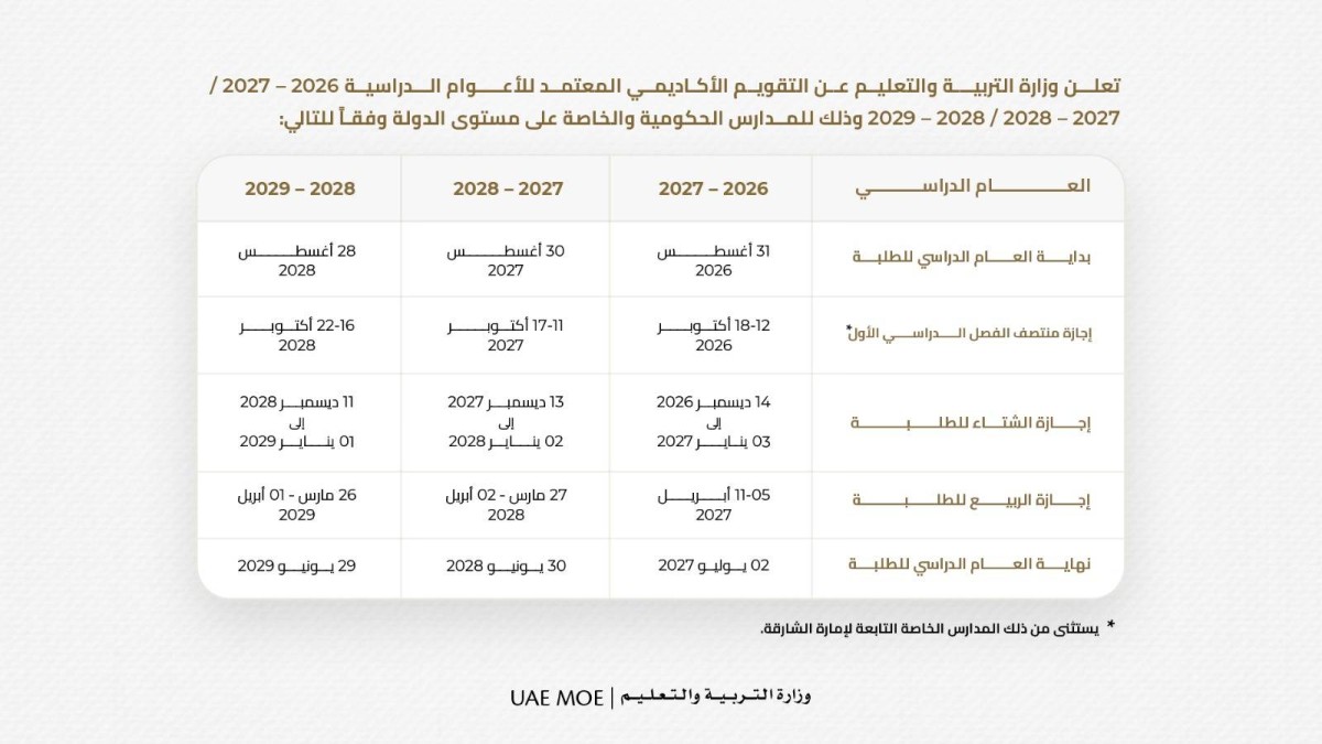أعلنت وزارة التربية والتعليم عن التقويم الأكاديمي المعتمد للأعوام الدراسية الثلاثة القادمة (2026–2027) (2027–2028) (2028–2029)، وذلك للمدارس الحكومية والخاصة، بما يسهم في استقرار المنظومة التعليمية في الدولة، ويدعم التخطيط المبكر على مستوى الطلبة وأولياء الأمور والميدان التربوي.