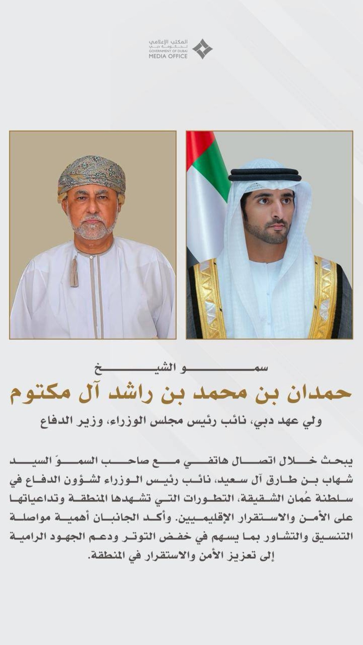 بحث سموّ الشيخ حمدان بن محمد بن راشد آل مكتوم، ولي عهد دبي نائب رئيس مجلس الوزراء وزير الدفاع، خلال اتصال هاتفي مع صاحب السموّ السيد شهاب بن طارق آل سعيد، نائب رئيس الوزراء لشؤون الدفاع في سلطنة عُمان الشقيقة، التطورات التي تشهدها المنطقة وتداعياتها على الأمن والاستقرار الإقليميين.