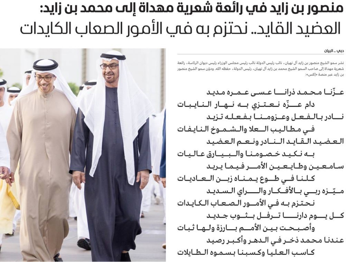 نشر سمو الشيخ منصور بن زايد آل نهيان، نائب رئيس الدولة نائب رئيس مجلس الوزراء رئيس ديوان الرئاسة، رائعة شعرية مهداة إلى صاحب السمو الشيخ محمد بن زايد آل نهيان، رئيس الدولة، حفظه الله. ودوّن سمو الشيخ منصور بن زايد عبر منصة «إكس»: