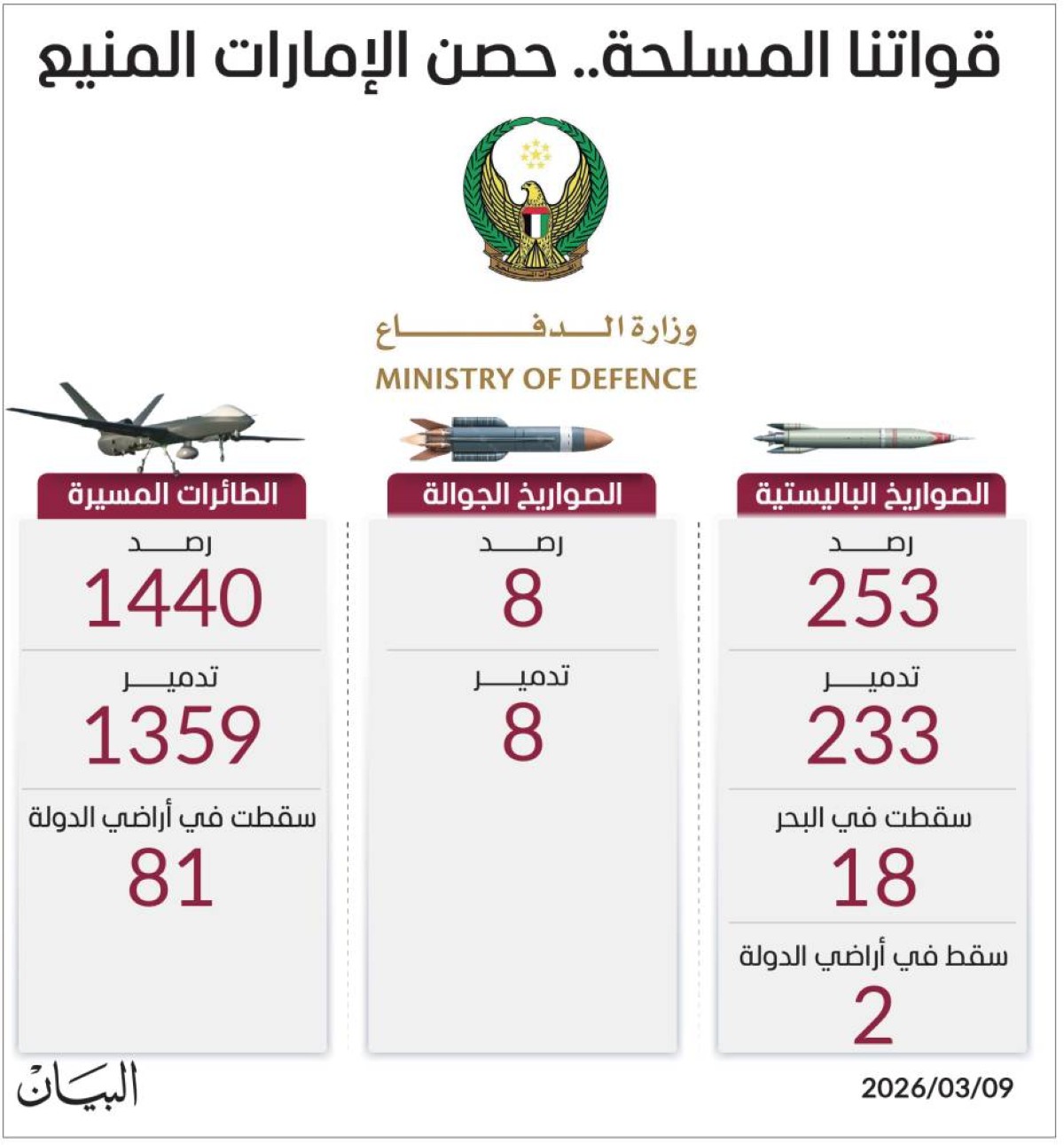 رصدت الدفاعات الجوية الإماراتية اليوم (9 مارس 2026) 15 صاروخا باليستيا حيث تم تدمير 12 صاروخا باليستيا، فيما سقطت 3 صواريخ باليستية في البحر، كما تم رصد 18 طائرة مسيرة، حيث تم اعتراض 17 طائرة مسيرة، بينما سقطت 1 طائرة مسيرة داخل أراضي الدولة.