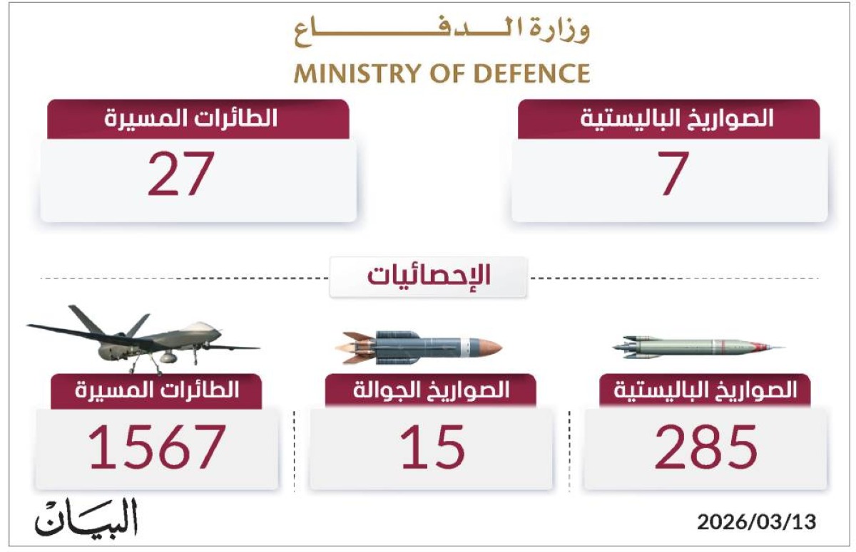 تعاملت الدفاعات الجوية الإماراتية أمس مع 7 صواريخ باليستية، و27 طائرة مسيرة قادمة من إيران، ليبلغ بذلك إجمالي ما تعاملت معه الدفاعات الجوية الإماراتية منذ بدء الاعتداءات الإيرانية السافرة 1867 صاروخاً ومسيرة، بواقع 285 صاروخاً باليستياً، و15 صاروخاً جوالاً، و1567 طائرة مسيرة.