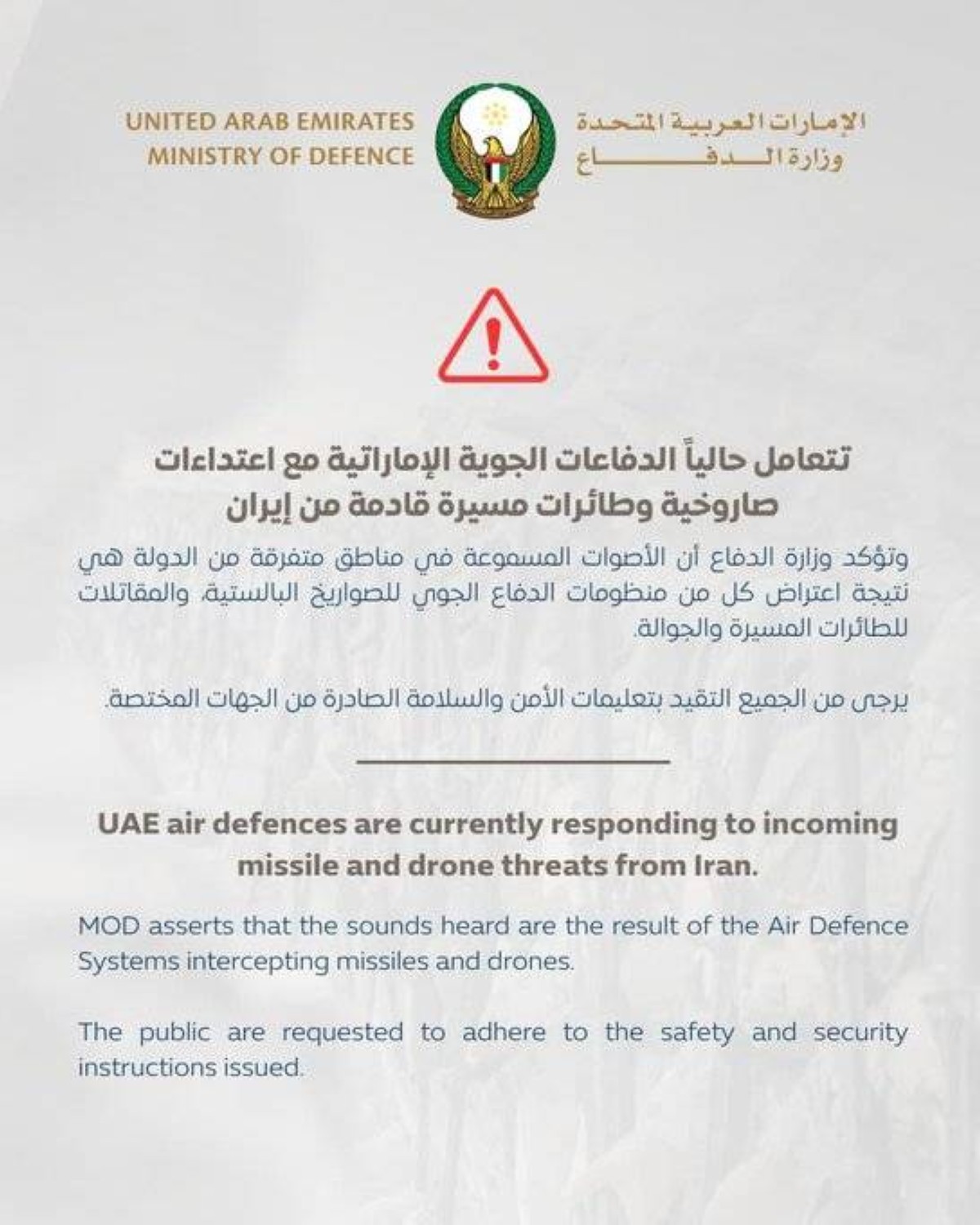 تتعامل حالياً الدفاعات الجوية الإماراتية مع اعتداءات صاروخية وطائرات مسيرة قادمة من إيران وتؤكد وزارة الدفاع أن الأصوات المسموعة بمناطق متفرقة من الدولة هي نتيجة اعتراض كل من منظومات الدفاع الجوي للصواريخ البالستية والمقاتلات للطائرات المسيرة والجوالة.