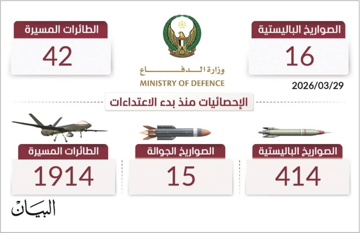 تعاملت الدفاعات الجوية الإماراتية (29 مارس 2026) مع 16 صاروخاً باليستياً و 42 طائرة مسيرة قادمة من إيران.
