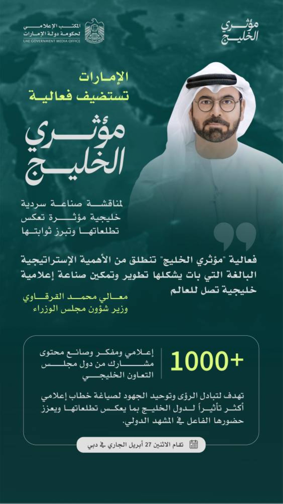 تستضيف دولة الإمارات فعالية "مؤثري الخليج"، المنصة الحوارية الخليجية التي ينظمها المكتب الإعلامي لحكومة دولة الإمارات، يوم 27 أبريل الحالي، في فندق "أتلانتس النخلة" في دبي، بمشاركة أكثر من 1000 إعلامي ومفكر وصانع محتوى من دول مجلس التعاون الخليجي، وذلك بهدف مناقشة صناعة سردية خليجية مؤثرة تعكس تطلعاتها وتبرز ثوابتها.