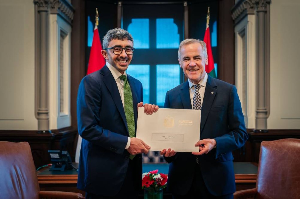 سلم الرسالة سمو الشيخ عبدالله بن زايد آل نهيان، نائب رئيس مجلس الوزراء وزير الخارجية، لدى لقائه معالي مارك كارني، رئيس وزراء كندا، وذلك في مستهل زيارة عمل يقوم بها سموه إلى العاصمة الكندية أوتاوا.