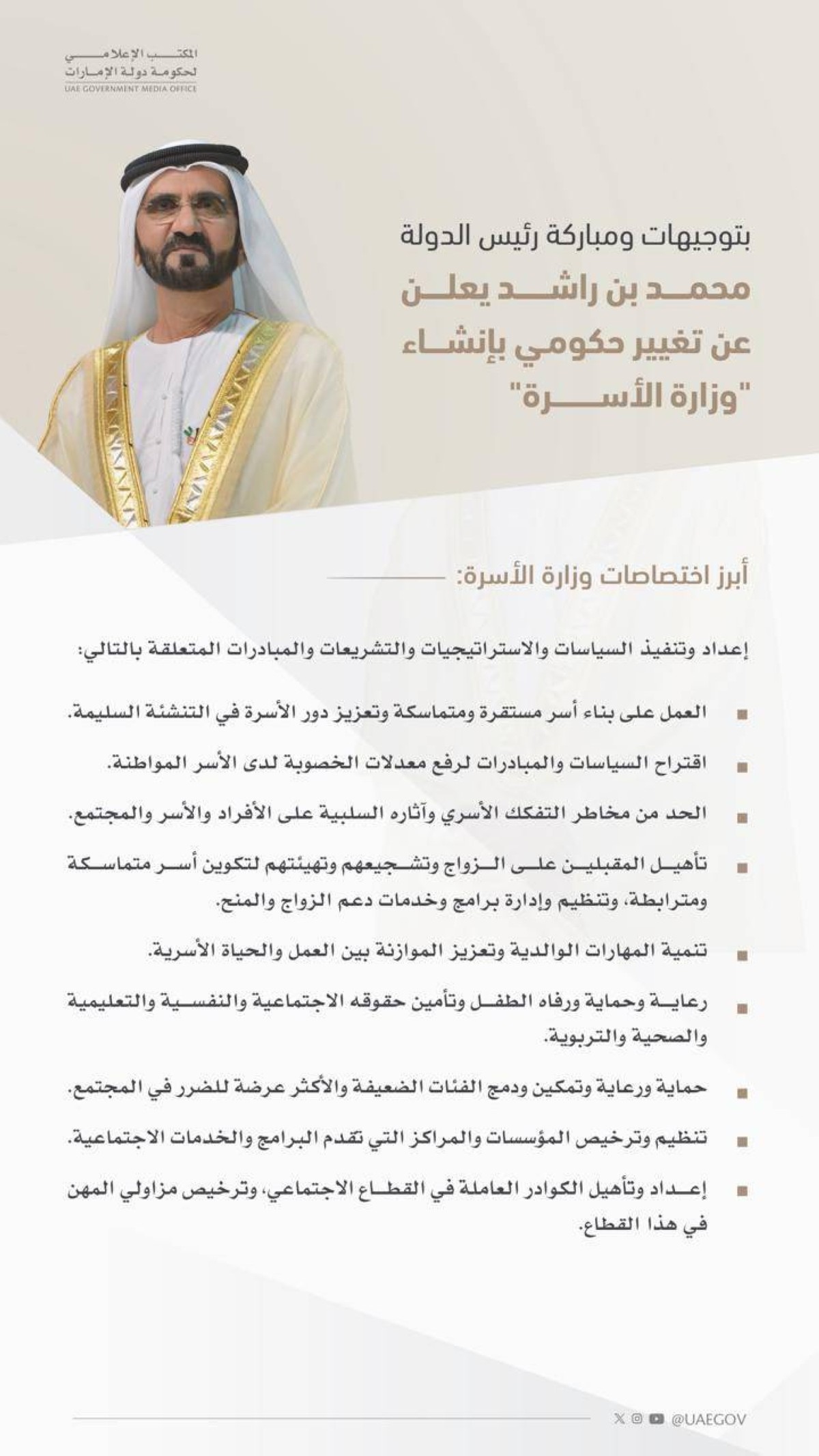 وأضاف صاحب السمو الشيخ محمد بن راشد آل مكتوم: "الأسرة أولوية وطنية .. وحجر الزاوية في المسيرة .. وضمان لمستقبل الوطن.. وتوجيهات رئيس الدولة في الاجتماعات السنوية الأخيرة كانت بضرورة العمل على برامج وطنية شاملة لزيادة تكوين الأسر في الدولة، وتعزيز نموها، وتمكينها، وترسيخ تماسكها واستقرارها ورفع معدلات الخصوبة في الدولة .. والوزارة الجديدة ستكون معنية بهذا الملف الوطني المهم".