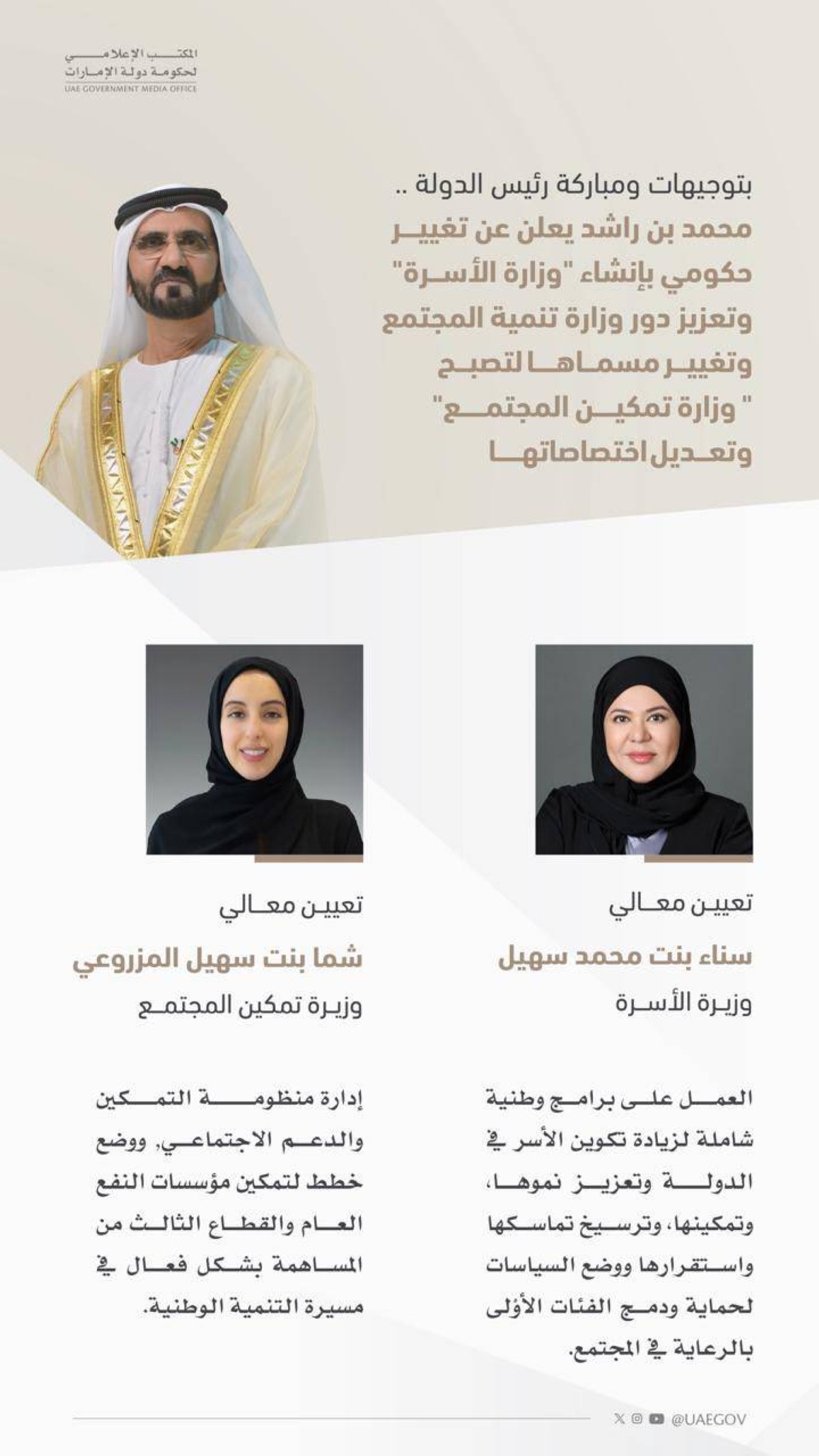 بتوجيهات ومباركة صاحب السمو الشيخ محمد بن زايد آل نهيان، رئيس دولة الإمارات “حفظه الله”.. أعلن صاحب السمو الشيخ محمد بن راشد آل مكتوم، نائب رئيس دولة الإمارات، رئيس مجلس الوزراء، حاكم دبي، "رعاه الله"، عن تغيير حكومي باستحداث وزارة "الأسرة"، وتعزيز دور وزارة تنمية المجتمع وتغيير مسماها لتصبح "وزارة تمكين المجتمع" وتعديل اختصاصاتها.