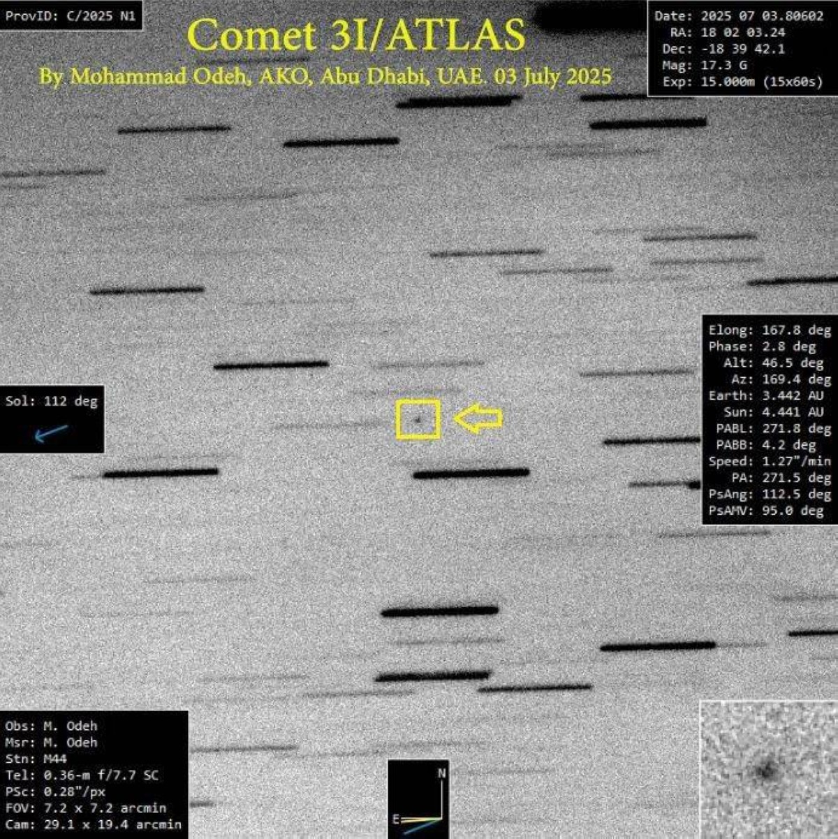 تمكن مرصد الختم الفلكي الواقع في صحراء أبوظبي، ساء يوم أمس الخميس، من تصوير مذنب قادم من مجموعة شمسية أخرى، برغم خفوت لمعانه البالغ 17.5، ما يجعل رؤيته صعبة إلا من خلال التلسكوبات الكبيرة.