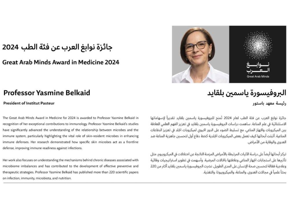 وقال صاحب السمو الشيخ محمد بن راشد آل مكتوم: نبارك اليوم للفائزة بجائزة نوابغ العرب عن فئة الطب لعام 2024، البروفيسورة ياسمين بلقايد من الجزائر، رئيسة معهد باستور في فرنسا... قدمت إسهامات استثنائية في علم المناعة، ودراسات مرتبطة بدور الميكروبات في تعزيز المناعة والوقاية من الأمراض... نشرت البروفيسورة ياسمين بلقايد أكثر من 220 بحثاً علمياً في مجالات العدوى والمناعة".