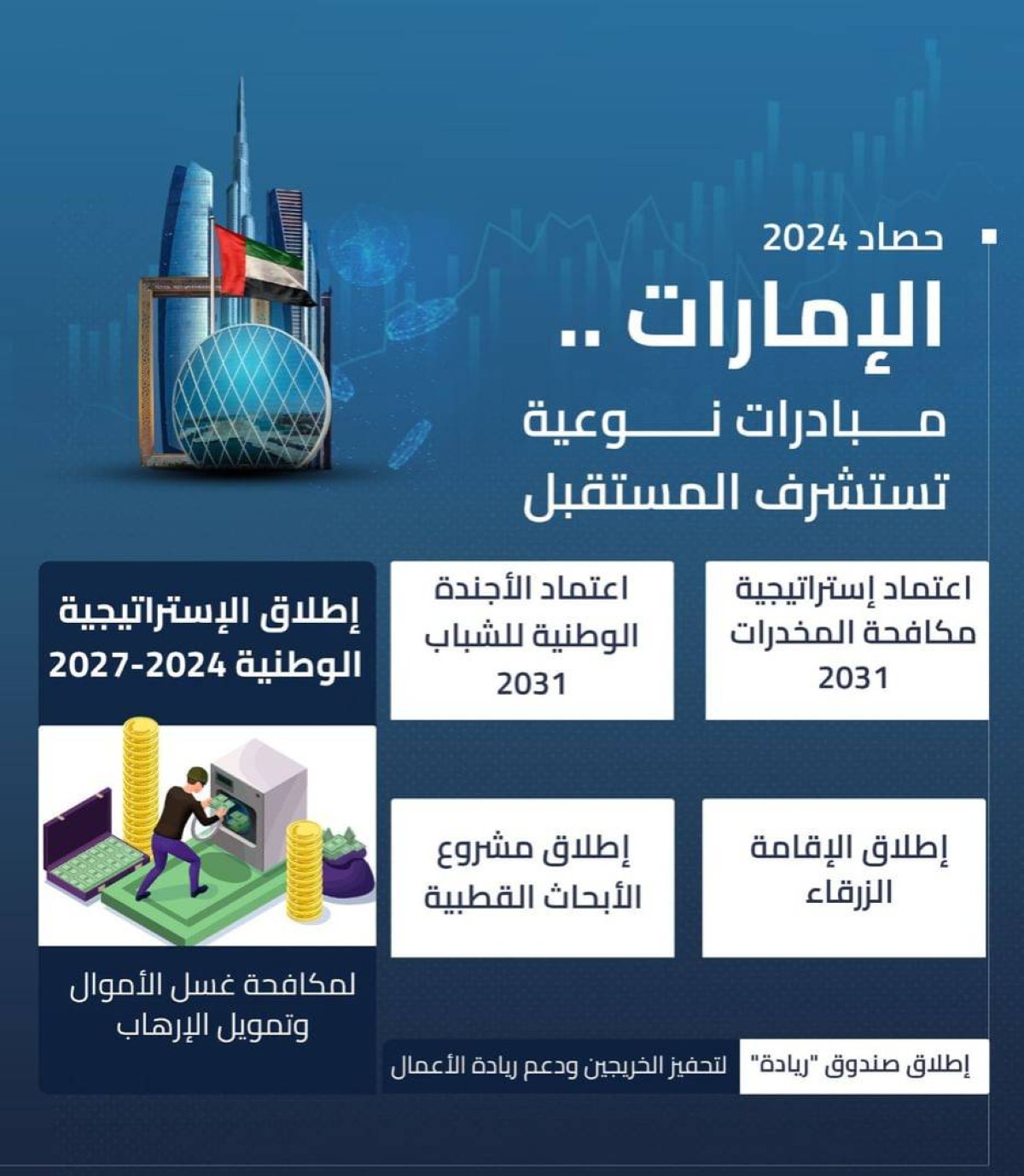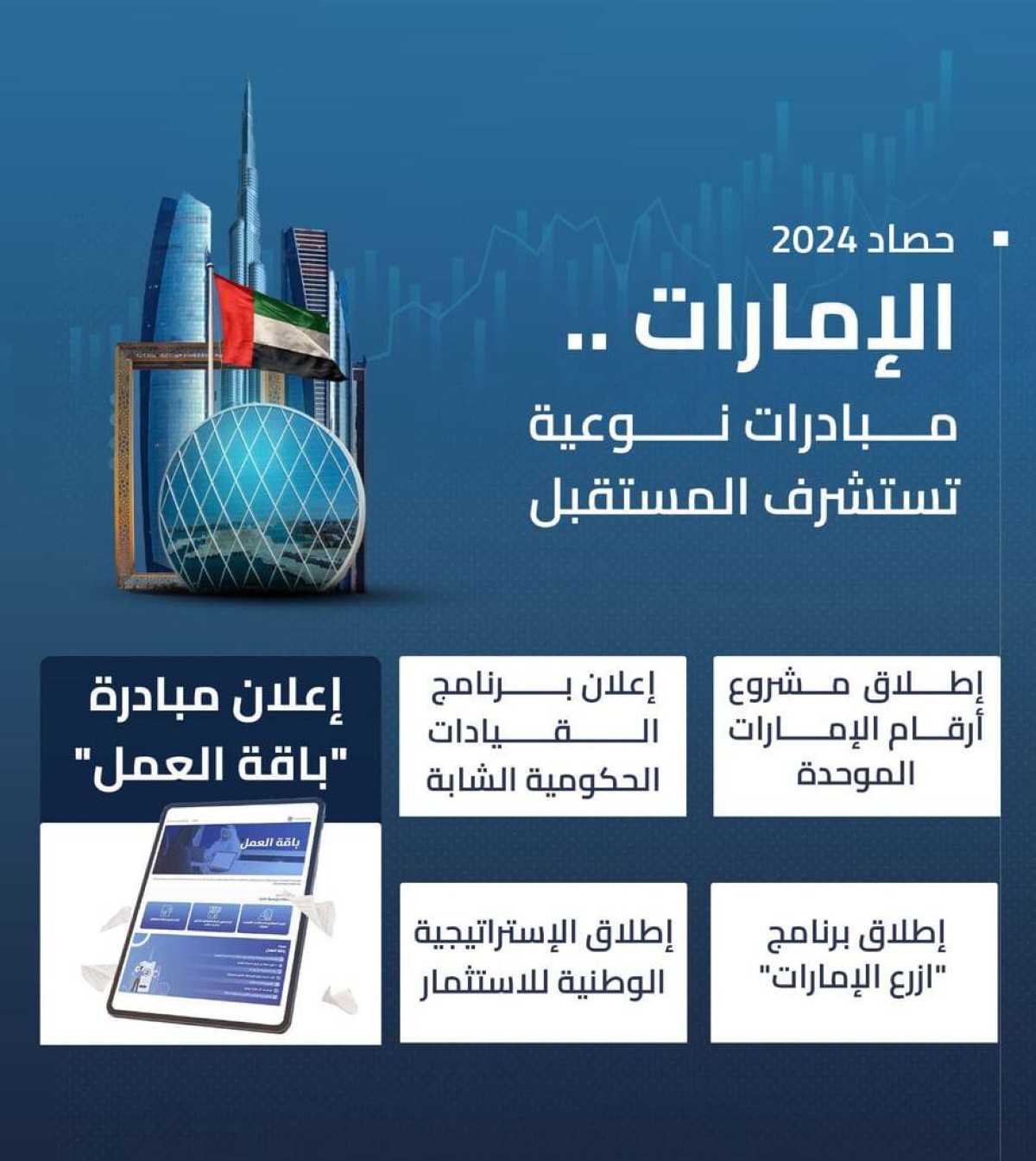 واصلت دولة الإمارات 2024 تدعيم مسيرتها التنموية ونهضتها الحضارية، بإطلاق مجموعة من المبادرات والخطط الإستراتيجية الطموحة، التي تعزز سمعة الدولة وقوتها الناعمة وريادتها العالمية في المجالات كافة.
