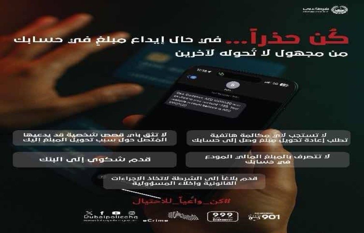 شرطة دبي: كُن حذراً..في حال إيداع مبلغ في حسابك من مجهول لا تُحوله