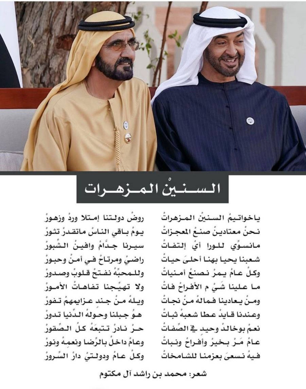 نشر صاحب السمو الشيخ محمد بن راشد آل مكتوم، نائب رئيس دولة الإمارات رئيس مجلس الوزراء حاكم دبي، رعاه الله، رائعة شعرية جديدة ، بعنوان " السنينْ المزهرات" قال فيها :