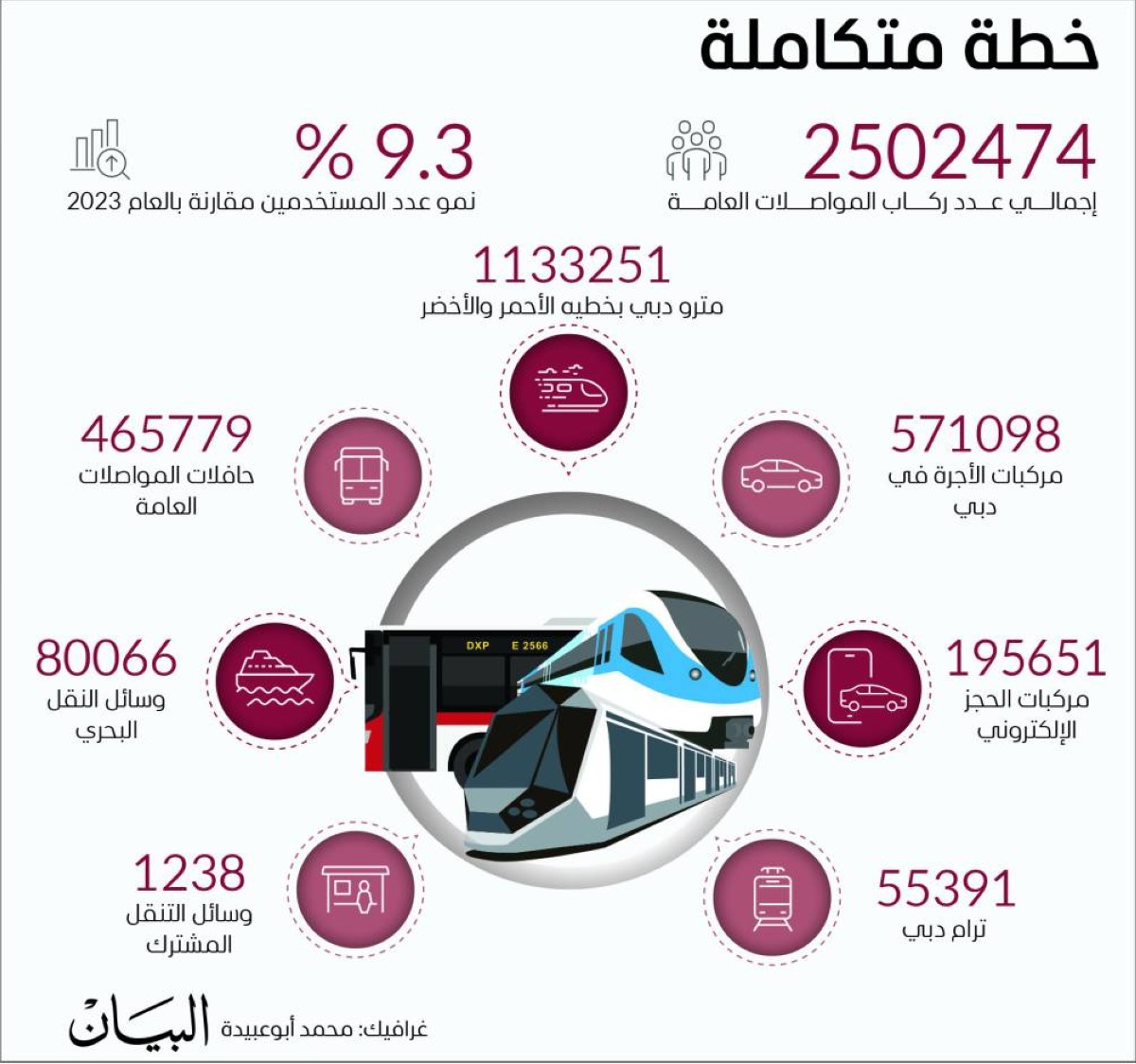 أعلنت هيئة الطرق والمواصلات في دبي أن عدد مستخدمي وسائل المواصلات العامة ومركبات الأجرة والحجز الالكتروني والتنقل المشترك خلال الاحتفال بفعاليات رأس السنة الميلادية 2025 وصل إلى أكثر من 2.5 مليون راكباً، بنسبة زيادة بلغت (9,3%) عن عدد ركاب ليلة رأس السنة الماضي 2024، الذي بلغ (2) مليون و(288) ألفاً و(631) راكباً.