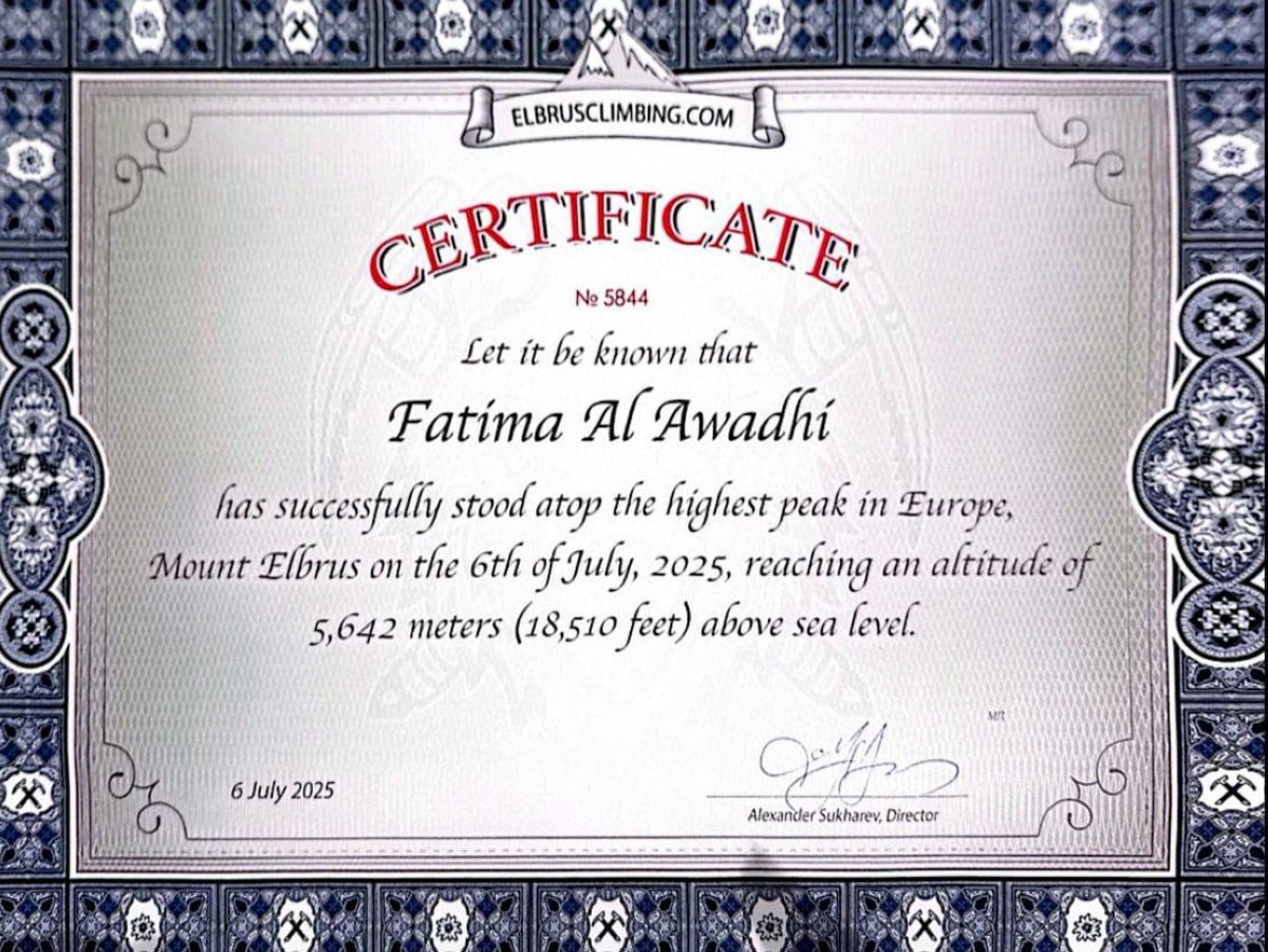 في إنجاز جديد يُضاف إلى سجل الإمارات المشرّف، تمكنت فاطمة عبد الرحمن العوضي، البالغة من العمر 17 عامًا، من بلوغ قمة جبل إلبروس في روسيا، والبالغ ارتفاعه 5642 مترا، لتصبح بذلك أصغر إماراتية تصل إلى أعلى قمة في أوروبا.