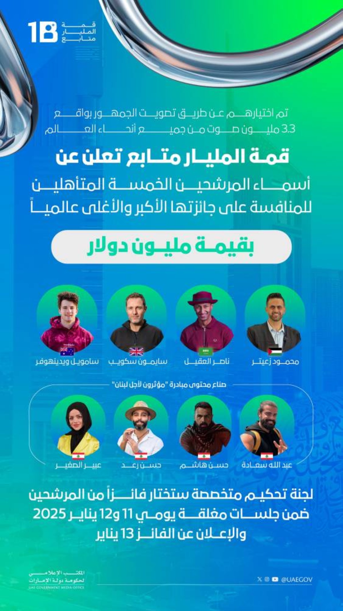 أعلنت قمة المليار متابع عن أسماء المرشحين الخمسة المتأهلين للمنافسة على جائزتها الأكبر والأغلى عالمياً بقيمة مليون دولار، والذين تم اختيارهم عن طريق تصويت الجمهور بواقع 3.3 ملايين صوت من جميع أنحاء العالم.
