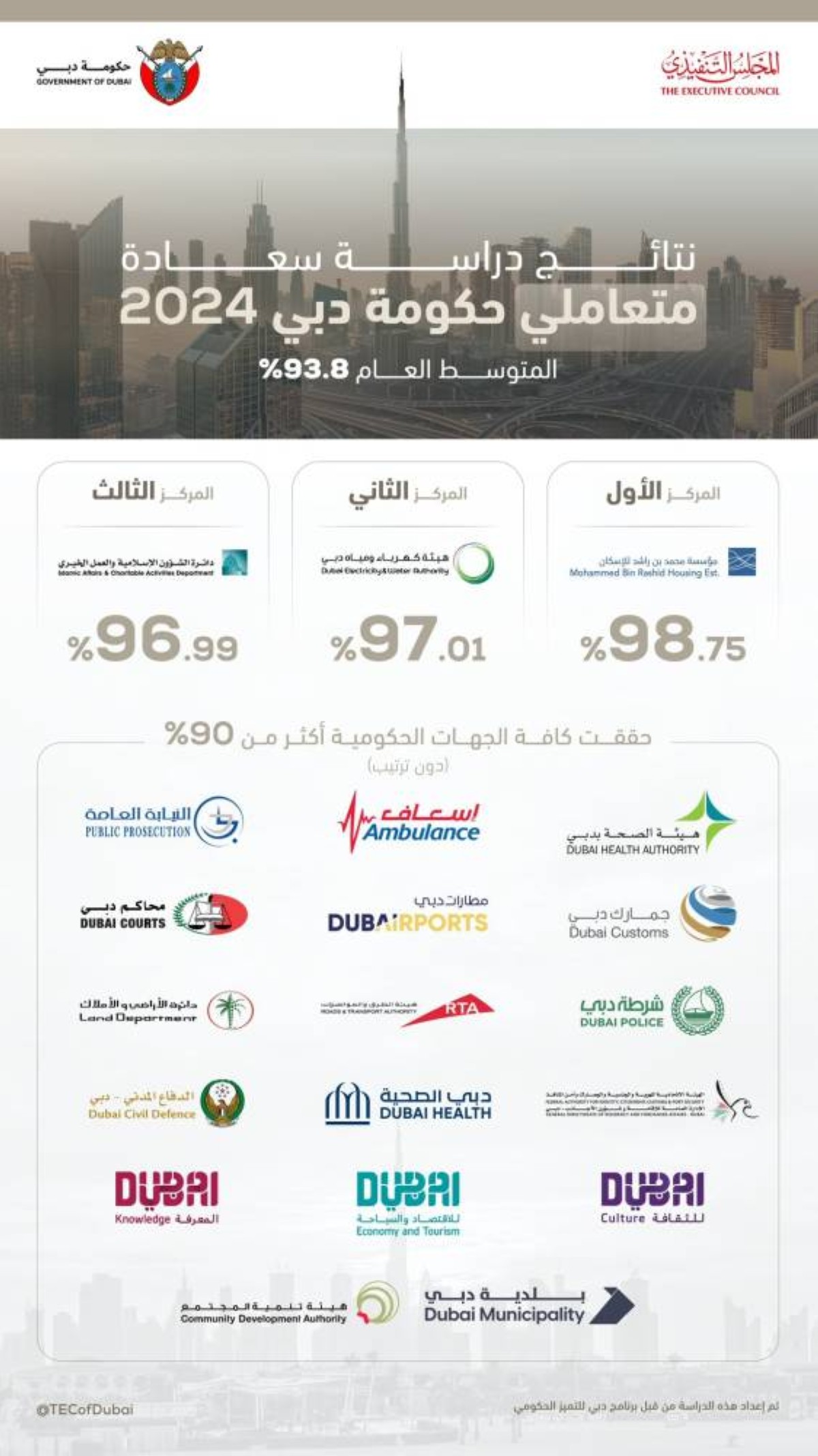 وحققت الجهات الحكومية التالية المراكز الأولى في نتائج دراسة مؤشر سعادة المتعاملين للعام 2024: مؤسسة محمد بن راشد للإسكان بنسبة 98.75%، وهيئة كهرباء ومياه دبي بنسبة 97.01%، ودائرة الشؤون الإسلامية والعمل الخيري بنسبة 96.99%.