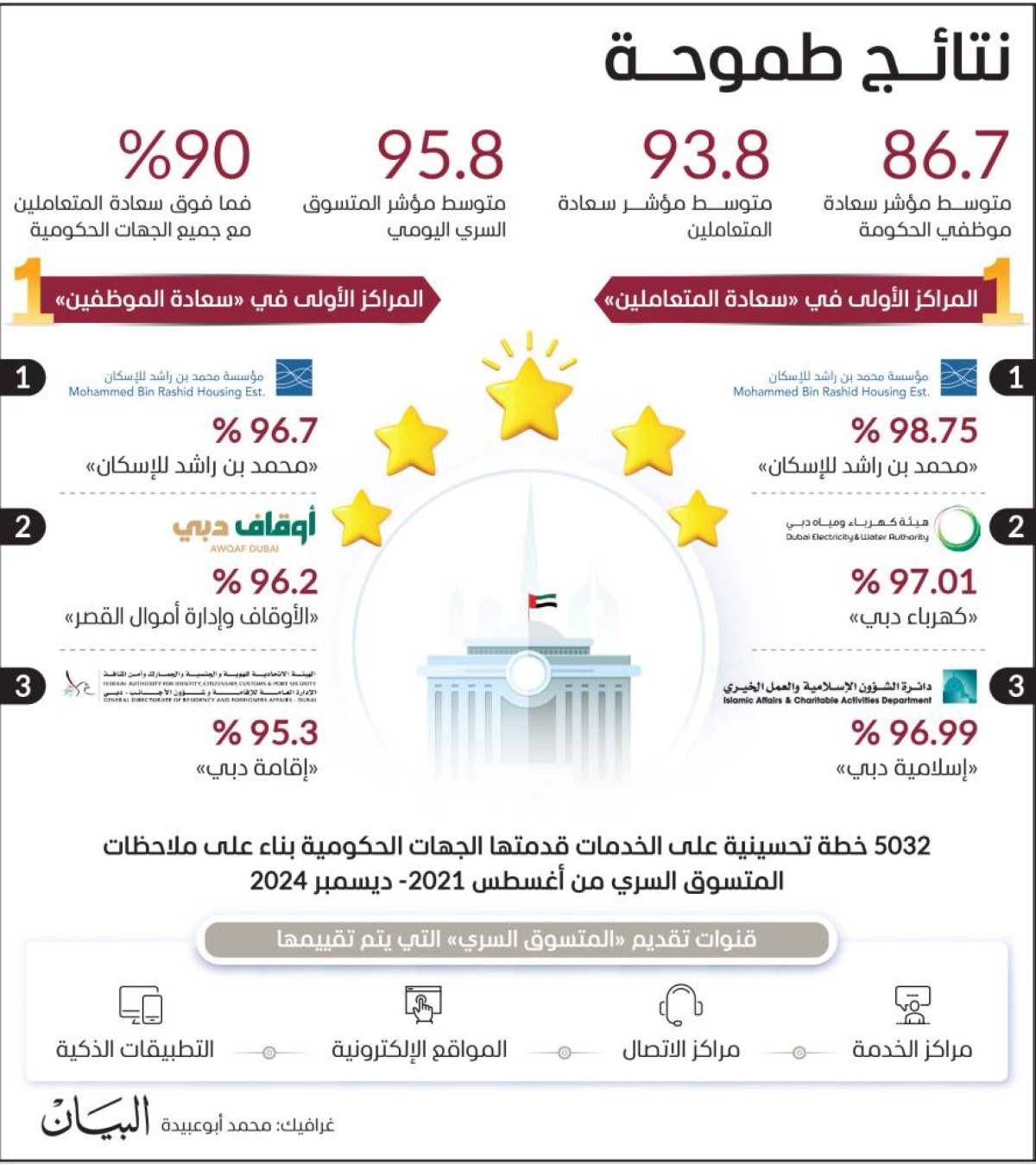 وسجلت نتائج مؤشر دراسة المتسوق السرّي اليومي لعام 2024 متوسطاً قدره 95.8% بما يؤكد أهميتها المحورية في تحفيز استدامة الأداء الحكومي المتميز، ويدعم مخرجات دراسة مؤشر سعادة المتعاملين وسعادة الموظفين في حكومة دبي.