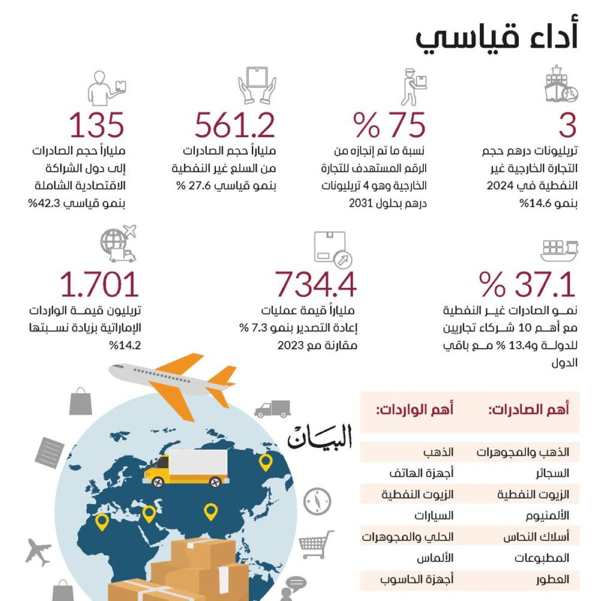 حيث سجلت 561.2 مليار درهم، بنسبة نمو قياسية وغير مسبوقة بلغت 27.6 %، لتحقق نحو 70 % من هدف الـ800 مليار درهم، الذي حددته رؤية «نحن الإمارات 2031»، كما زادت مساهمة الصادرات غير النفطية إلى 18.7 % من تجارة الإمارات غير النفطية، خلال 2024، مرتفعة من 16.8 % في 2023 وما نسبته 14.1 % فقط خلال 2019.