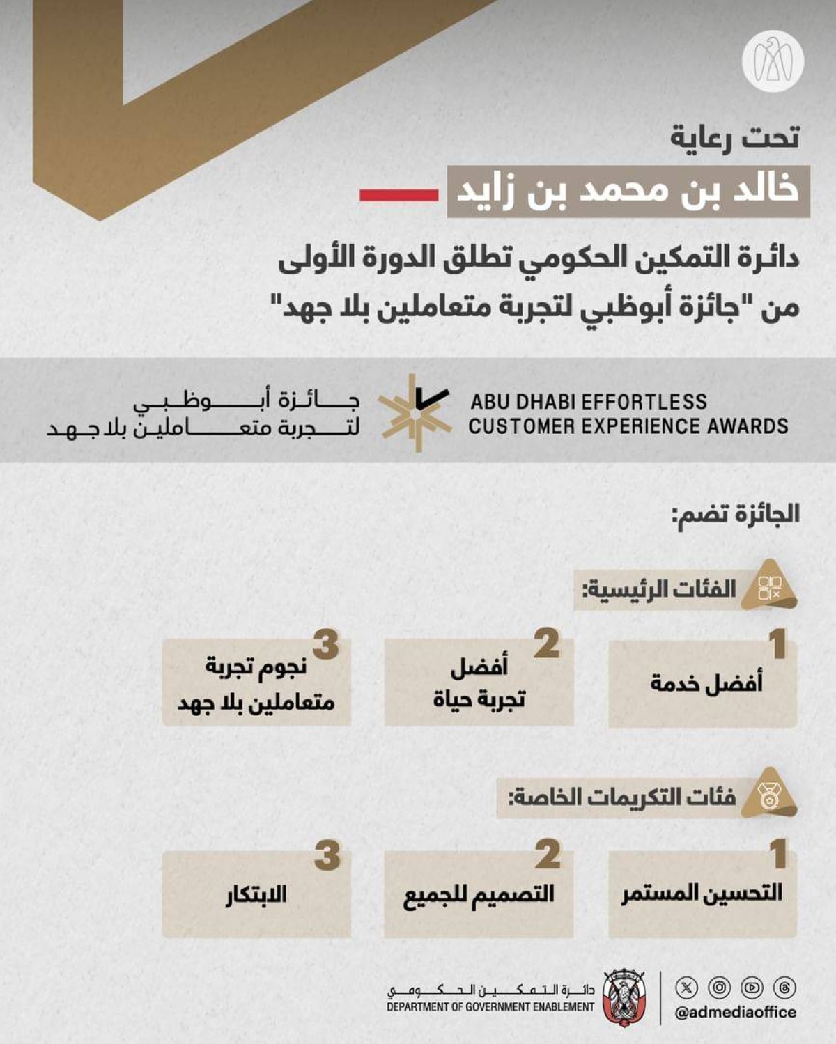 تحت رعاية سموّ الشيخ خالد بن محمد بن زايد آل نهيان ، ولي عهد أبوظبي ، رئيس المجلس التنفيذي لإمارة أبوظبي، أطلقت دائرة التمكين الحكومي - أبوظبي ، جائزة أبوظبي لتجربة متعاملين بلا جهد في دورتها الأولى.