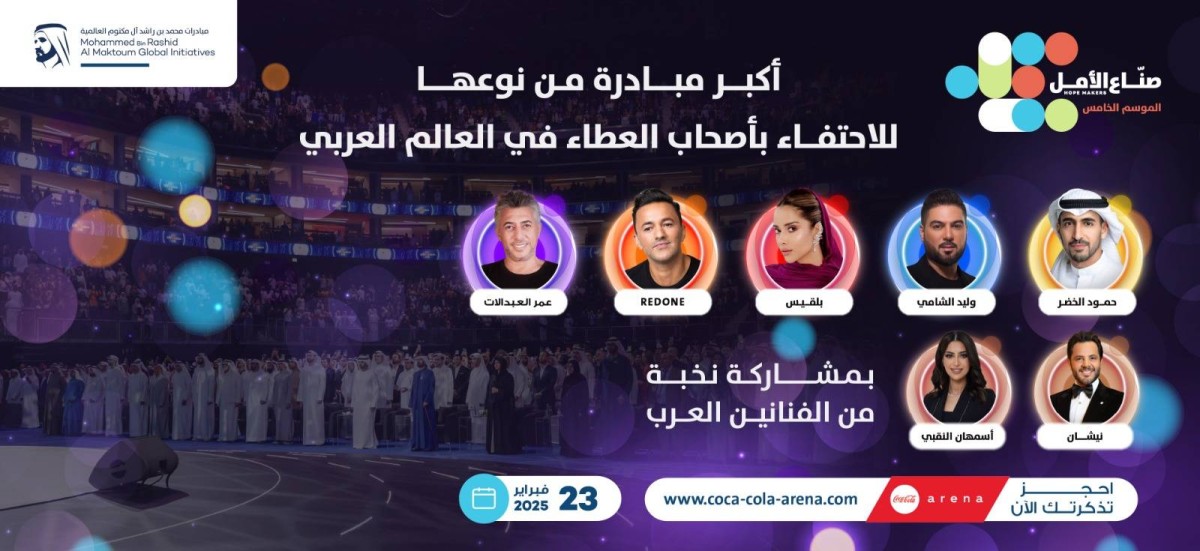 وأعلنت "صناع الأمل"، المبادرة الأكبر من نوعها عربياً لتكريم أصحاب البذل والعطاء عن طرح تذاكر الحفل الختامي لنسختها الخامسة، ويقدمه الإعلاميان نيشان ديرهاروتيونيان وأسمهان النقبي، عبر الموقع الإلكتروني: www.coca-cola-arena.com.