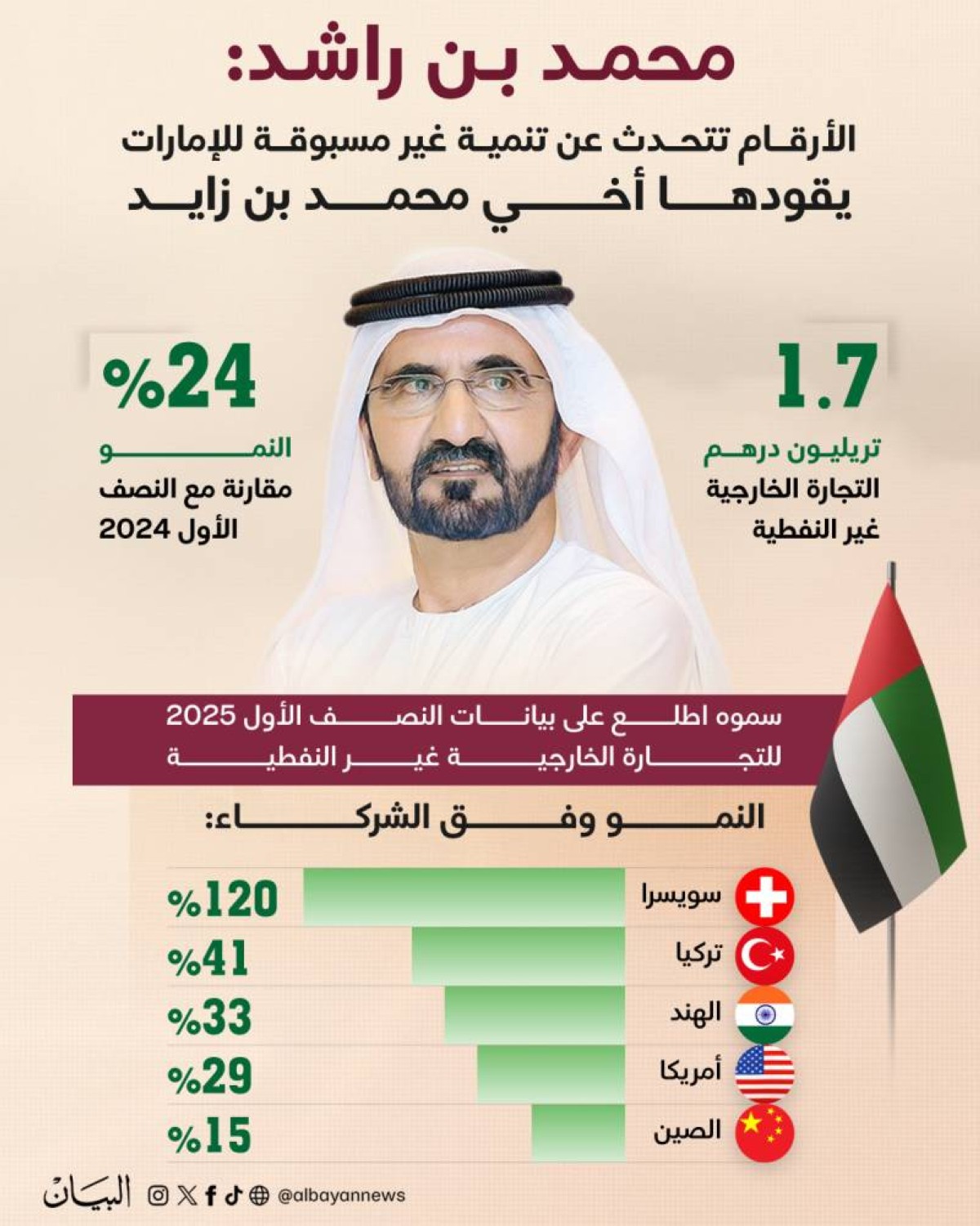 أكد صاحب السمو الشيخ محمد بن راشد آل مكتوم نائب رئيس دولة الإمارات رئيس مجلس الوزراء حاكم دبي "رعاه الله"، أن تجارة الإمارات الخارجية غير النفطية بلغت 1.7 تريليون درهم في النصف الأول بنمو بلغ 24% مقارنة مع النصف الأول من العام السابق.