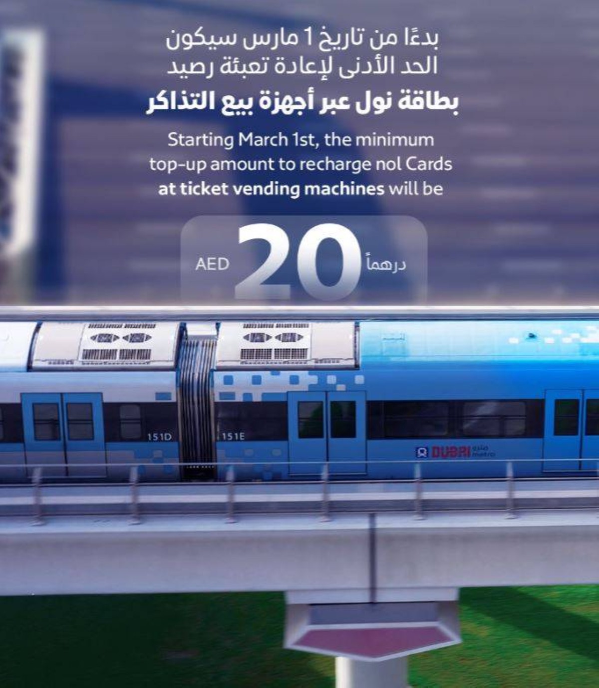 أعلنت هيئة الطرق والمواصلات في دبي أنه اعتبارًا من 1 مارس 2025، سيتم تحديد الحد الأدنى لإعادة شحن بطاقة نول عبر أجهزة بيع التذاكر بمبلغ 20 درهماً.