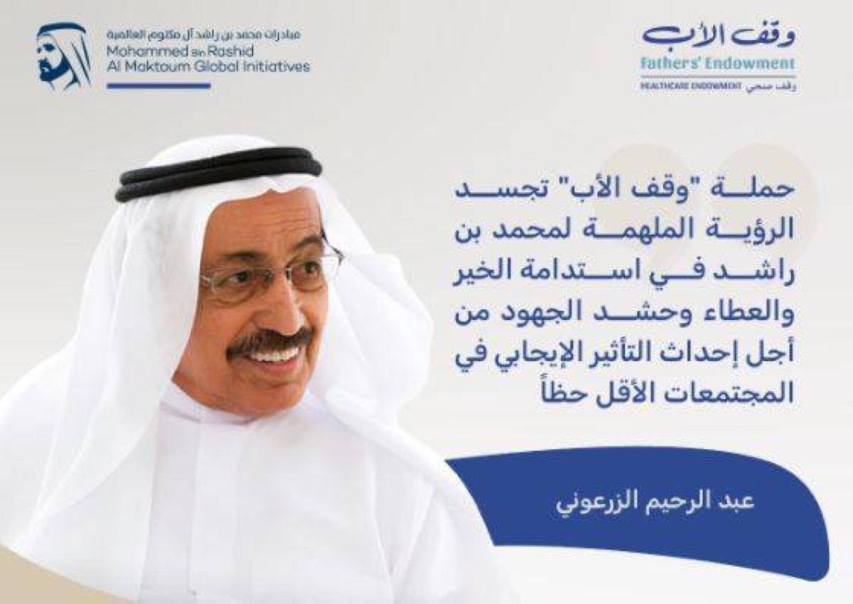 وتأتي هذه المساهمة في سياق التفاعل المجتمعي الكبير مع حملة "وقف الأب" التي تنضوي تحت مظلة مؤسسة "مبادرات محمد بن راشد آل مكتوم العالمية"، وتسعى إلى تكريم الآباء من خلال إتاحة الفرصة لكل شخص للتبرع باسم والده في الحملة، وترسيخ قيم بر الوالدين والمودة والتراحم والتكافل بين أفراد المجتمع، وتعزيز موقع الإمارات في مجال العمل الخيري والإنساني، وتطوير مفهوم الوقف الخيري، وإحداث حراك مجتمعي واسع النطاق يساهم في تحقيق المستهدفات النبيلة للحملة الرمضانية الوقفية.