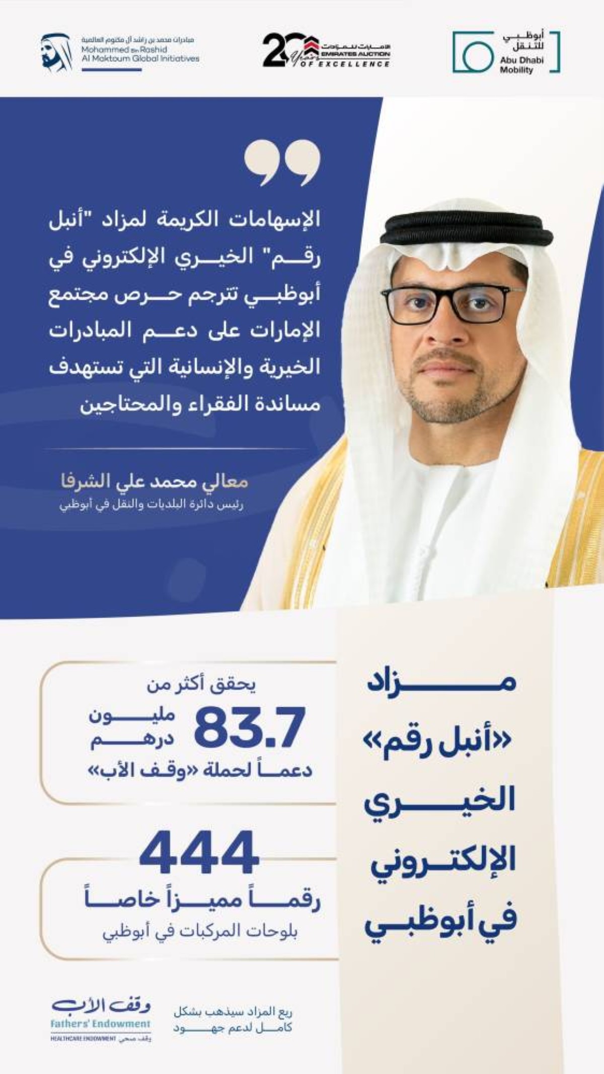 جمع مزاد "أنبل رقم" الخيري الإلكتروني الذي نظمه مركز النقل المتكامل "أبوظبي للتنقل" التابع لدائرة البلديات والنقل في أبوظبي، 83.784 مليون درهم، لدعم جهود حملة "وقف الأب" التي أطلقها صاحب السمو الشيخ محمد بن راشد آل مكتوم، نائب رئيس الدولة، رئيس مجلس الوزراء، حاكم دبي، رعاه الله، تزامناً مع شهر رمضان الفضيل، بهدف تكريم الآباء في دولة الإمارات من خلال إنشاء صندوق وقفي مستدام، يخصص ريعه لتوفير العلاج والرعاية الصحية للفقراء والمحتاجين وغير القادرين.