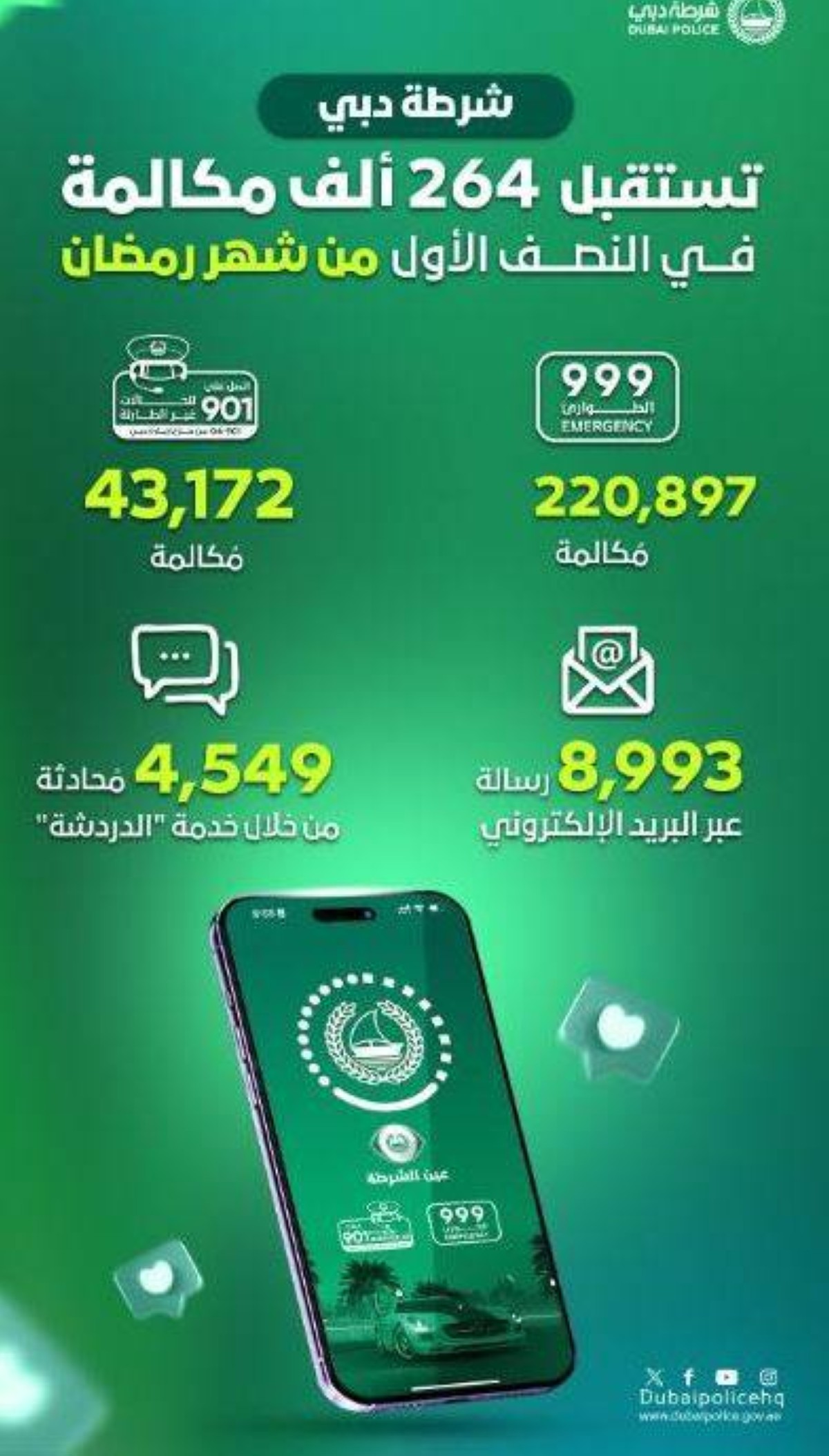 تمكن موظفو القيادة العامة لشرطة دبي في إدارة مركز القيادة والسيطرة في الإدارة العامة للعمليات، ومركز الاتصال 901، من استقبال 264 ألفاً و69 مكالمة في النصف الأول من شهر رمضان الفضيل، بواقع 220 ألفاً و897 مكالمة على رقم الطوارئ 999، و43 ألفاً و172 مكالمة على الرقم 901 المخصص للمكالمات غير الطارئة.