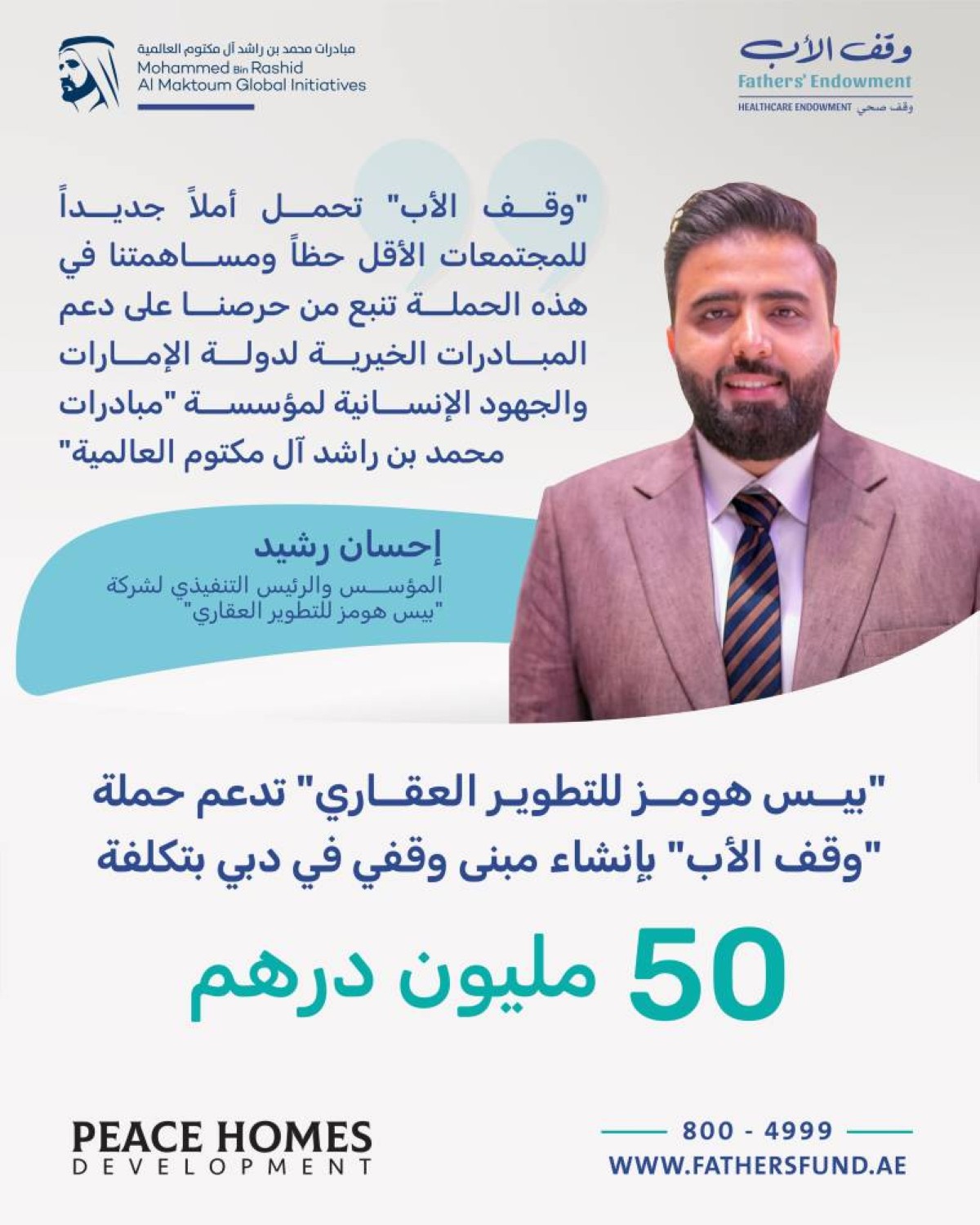 وأكد إحسان رشيد المؤسس والرئيس التنفيذي لشركة "بيس هومز للتطوير العقاري"، أن حملة "وقف الأب" تحمل أملاً جديداً للمجتمعات الأقل حظاً، وتمنح المرضى من المحتاجين والفقراء وغير القادرين فرصة الحصول على الرعاية الصحية المستدامة وأسباب الشفاء، من خلال بناء وإعادة تأهيل المستشفيات ودعم المنظومة الصحية في تلك المجتمعات.