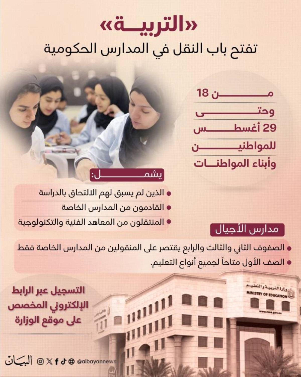 أعلنت وزارة التربية والتعليم عن فتح باب النقل في المدارس الحكومية لفئة المواطنين وأبناء المواطنات، خلال الفترة من 18 وحتى 29 أغسطس الجاري، وفق ضوابط محددة تضمن سلاسة الإجراءات وتنظيم عملية التسجيل.
