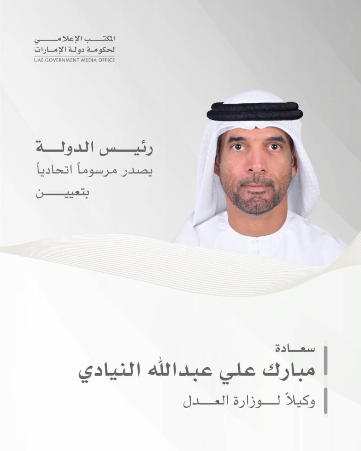 أصدر صاحب السمو الشيخ محمد بن زايد آل نهيان، رئيس الدولة، "حفظه الله"، مرسوماً اتحادياً بتعيين سعادة مبارك علي عبدالله النيادي، وكيلاً لوزارة العدل.