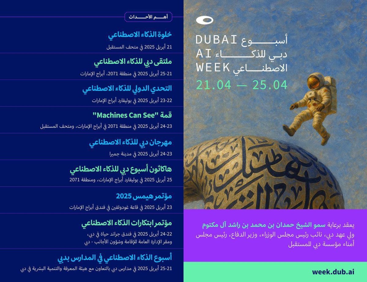 ويتضمن أسبوع دبي للذكاء الاصطناعي 9 أحداث رئيسية في مختلف أنحاء دبي تشمل "خلوة الذكاء الاصطناعي" يوم الاثنين 21 أبريل في متحف المستقبل، و"ملتقى دبي للذكاء الاصطناعي" من 21 إلى 25 أبريل في منطقة 2071 بأبراج الإمارات، و"التحدي الدولي للذكاء الاصطناعي" من 22 إلى 23 أبريل في منطقة 2071 بأبراج الإمارات، و"مهرجان دبي للذكاء الاصطناعي" من 23 إلى 24 أبريل في مدينة جميرا، وقمة "الآلات يمكنها أن ترى" (Machines Can See) من 23 إلى 24 أبريل في متحف المستقبل ومنطقة 2071 بأبراج الإمارات، و"مؤتمر ابتكارات الذكاء الاصطناعي" من 22 أبريل وحتى 24 أبريل في فندق جراند حياة بدبي، و"مؤتمر هيمس 2025" الحدث العالمي المتخصص في مجال مستقبل الصحة يوم الأربعاء 23 أبريل في فندق أبراج الإمارات، و"هاكاثون أسبوع دبي للذكاء الاصطناعي" يوم الجمعة 25 أبريل في منطقة 2071 بأبراج الإمارات، إضافة إلى برنامج شامل من الفعاليات في مدارس دبي تنظمه هيئة المعرفة والتنمية البشرية على مدار الأسبوع.