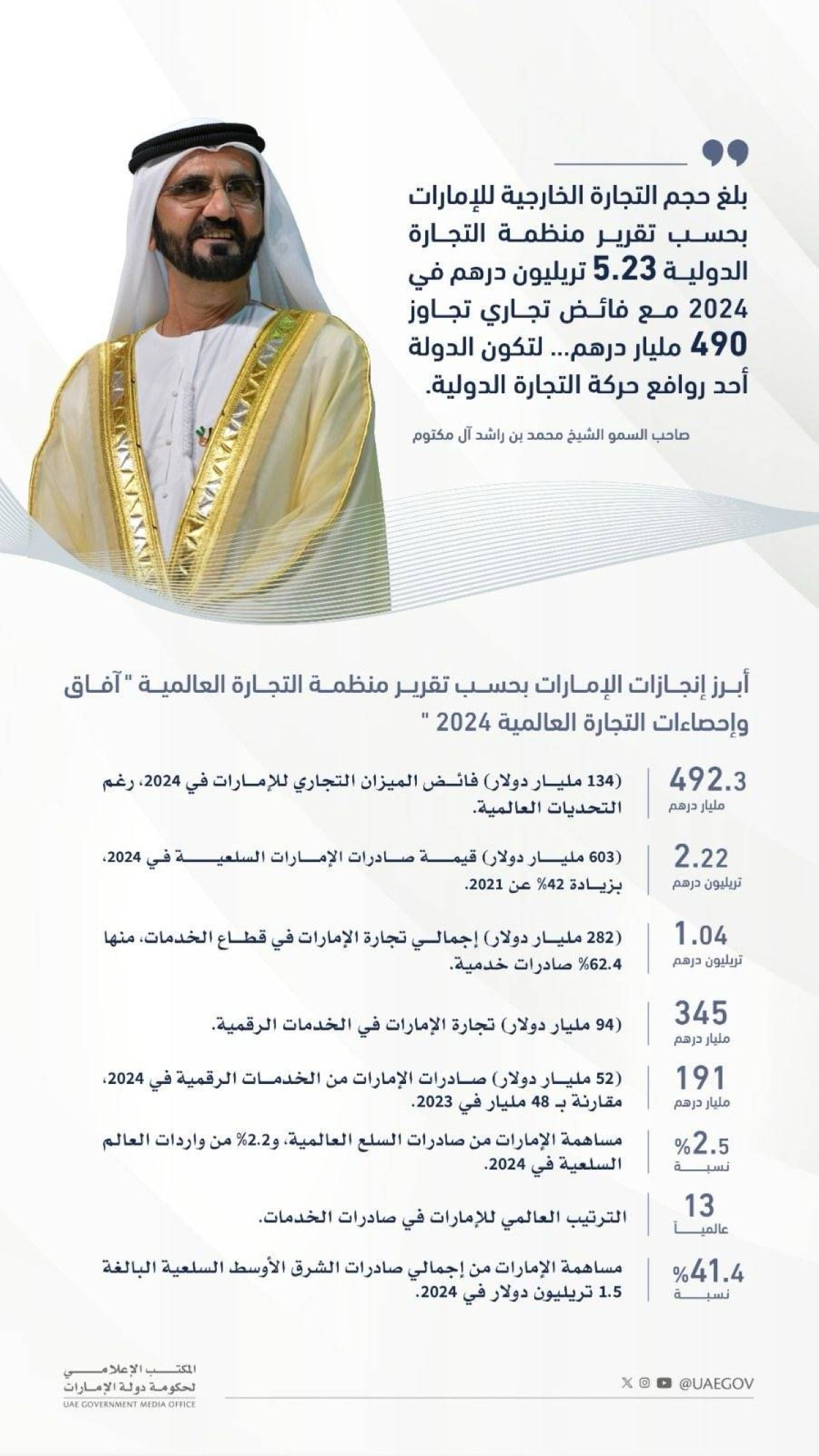 وأضاف صاحب السمو الشيخ محمد بن راشد آل مكتوم أنه حسب آخر تقرير لمنظمة التجارة العالمية تم نشره قبل أيام ، بلغ حجم التجارة الخارجية للإمارات 5.23 تريليونات درهم في 2024 مع فائض تجاري تجاوز 490 مليار درهم لتكون الدولة إحدى روافع حركة التجارة الدولية ، وتقدمت لتصبح في المرتبة الـ11 عالمياً في صادرات السلع وال13 عالمياً في صادرات الخدمات.