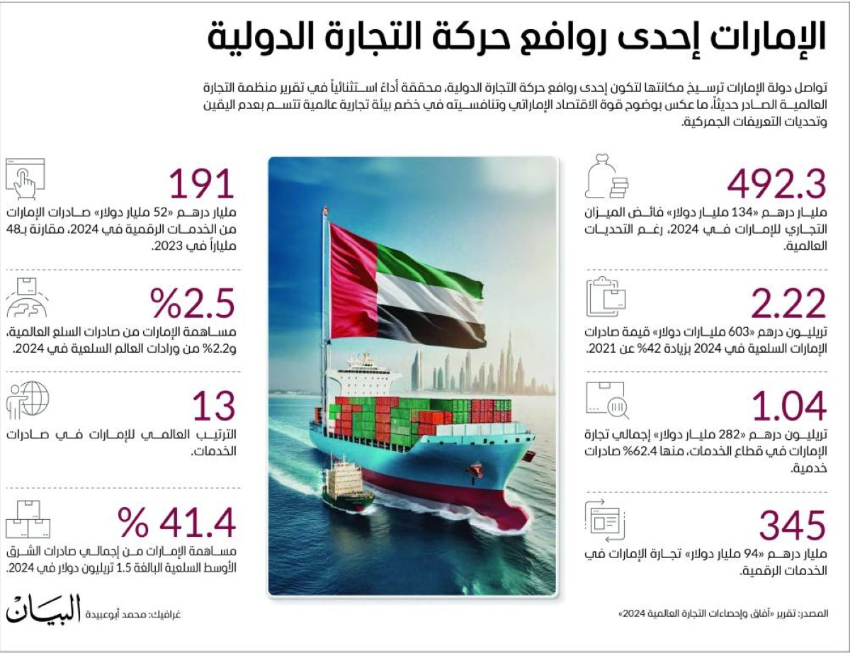 وتفصيلاً، واصلت دولة الإمارات العربية المتحدة ترسيخ مكانتها قوة تجارية عالمية، محققة أداءً استثنائياً في تقرير منظمة التجارة العالمية الصادر حديثاً ما عكس بوضوح قوة الاقتصاد الإماراتي وتنافسيته في خضم بيئة تجارية عالمية تتسم بعدم اليقين وتحديات التعريفات الجمركية.